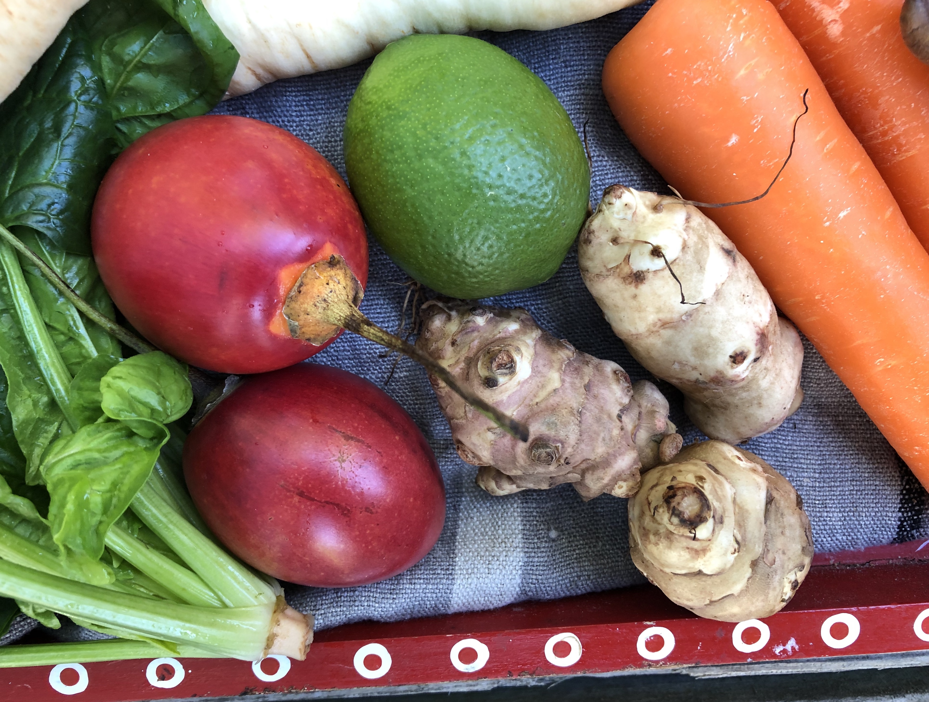 So to food….and in the basket this week were parsnips which I love, on their own or mixed in a mash with potatoes, carrots, spinach, a glossy red capsicum, pears, limes and Jerusalem Artichokes to make into soup, and tamarillos, which are a bit of an acquired taste but lovely added to a salad or macerated with vanilla.