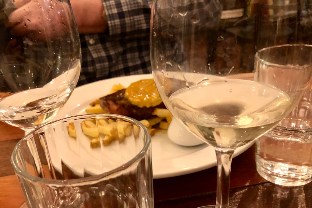 For our main dishes, I chose the fish (which was moki this time), served with Jerusalem artichokes, winter greens and a citrus based sauce. Karl had the steak frites served with Café de Paris butter, which is melted onto the meat with a miniature blow torch at the table – a fun touch that always brings oohs and aahs.