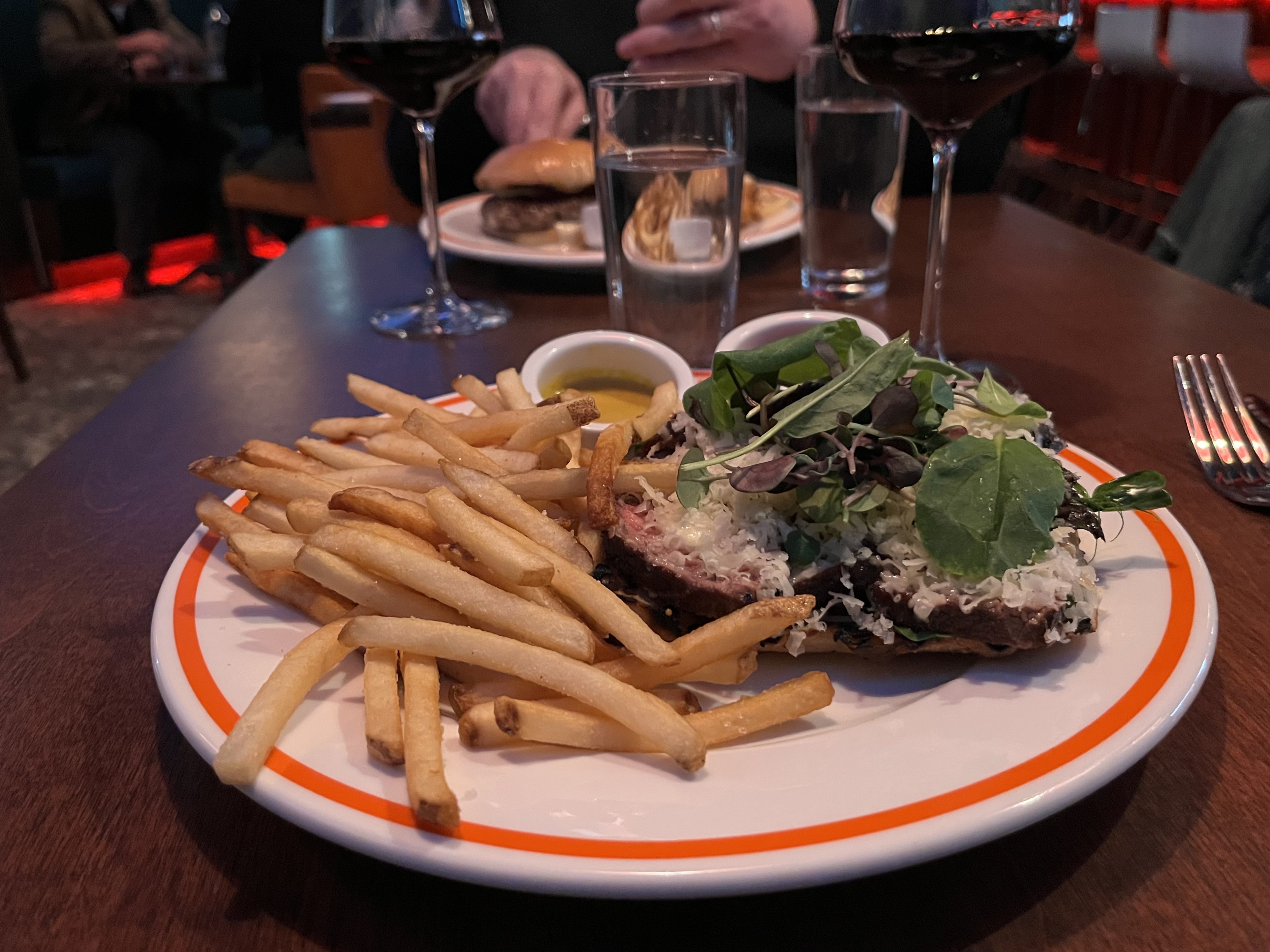 First up, after my Pilates class on Thursday, we decided to treat ourselves to a post-Covid meal out at Concord. Opened earlier this year, this was our second visit. The menu is a mix of things like shrimp cocktail and steak sandwiches, and a red interior with a sort of 1970s feel to it. This visit I opted for the oysters which were from Waiheke Island and the steak sandwich again as I had really enjoyed it last time. Karl had the chicken liver pâté and cheeseburger. There was a lot of food, especially as there was also some lovely warm bread with garlic butter, but it was really good and we just rolled home.