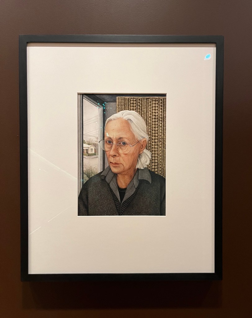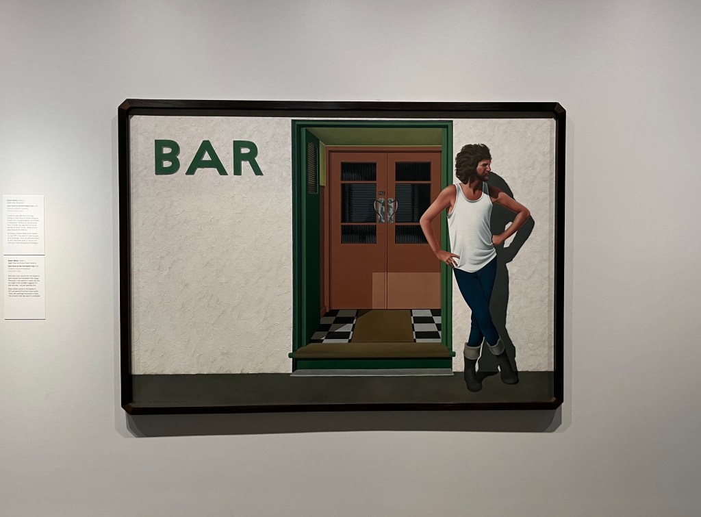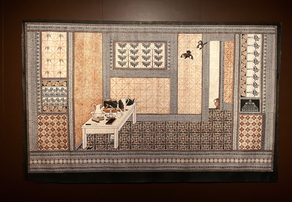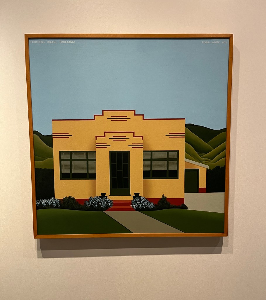 On Wednesday morning, I headed over to Te Papa to see the Robin White exhibition. The works were from her 50-year career and were ones are normally housed in galleries and homes all over Aotearoa New Zealand. The exhibition included early watercolour and drawings, works from her time in the Otago Peninsula and pieces from her collaborations with Pacific artists. Below are four pieces I particularly liked, starting with the self portrait in the top left. Next to that you can see Fortress House, Paremata, so called because the artist thought it was so neat and tidy and never saw anyone there. The distinctive Art Deco building is so typical around New Zealand. The picture bottom left is a work on bark cloth created in collaboration with Tamari Cabeikanacea, and is an interior based in a living room in Fiji. A large scale work, That Vase, it is stunning seen on a wall as opposed to a photo. One of my favourite pictures was Sam Hunt at the Portobello Pub from 1978. Again, in real life this canvas really stood out – I just love his casual stance, looking as if he is waiting for someone.