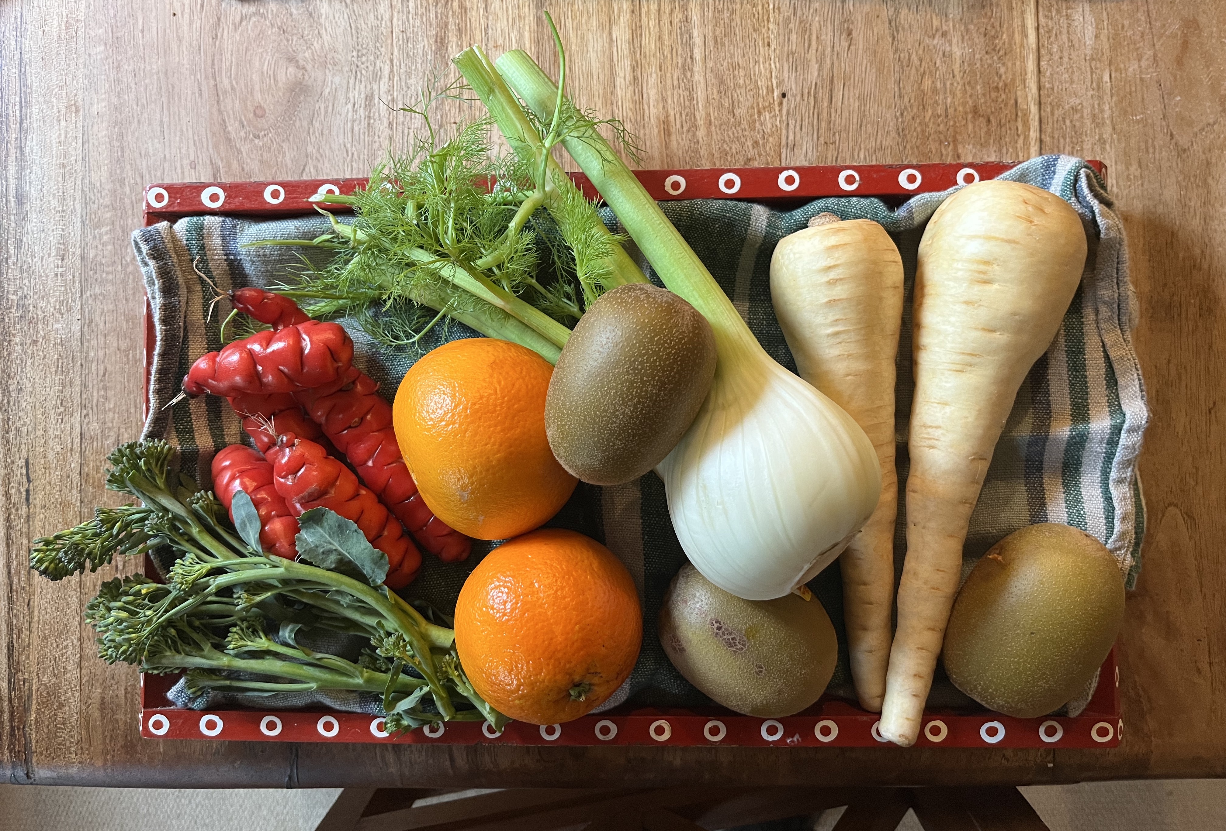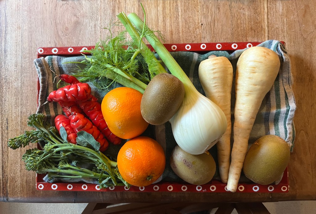 Sticking with food, I had lunch on Wednesday at perennial favourite Squirrel, enjoying a roasted winter vegetable sandwich. In our basket this week were oranges and golden kiwi fruit to boost our vitamin C, fennel, parsnips, more bright red yams (oca) and some fine stemmed broccoli, along with a packet of soup mix (lentils, barley, split peas) for Wednesday’s soup, and pork mince for this pasta bake.