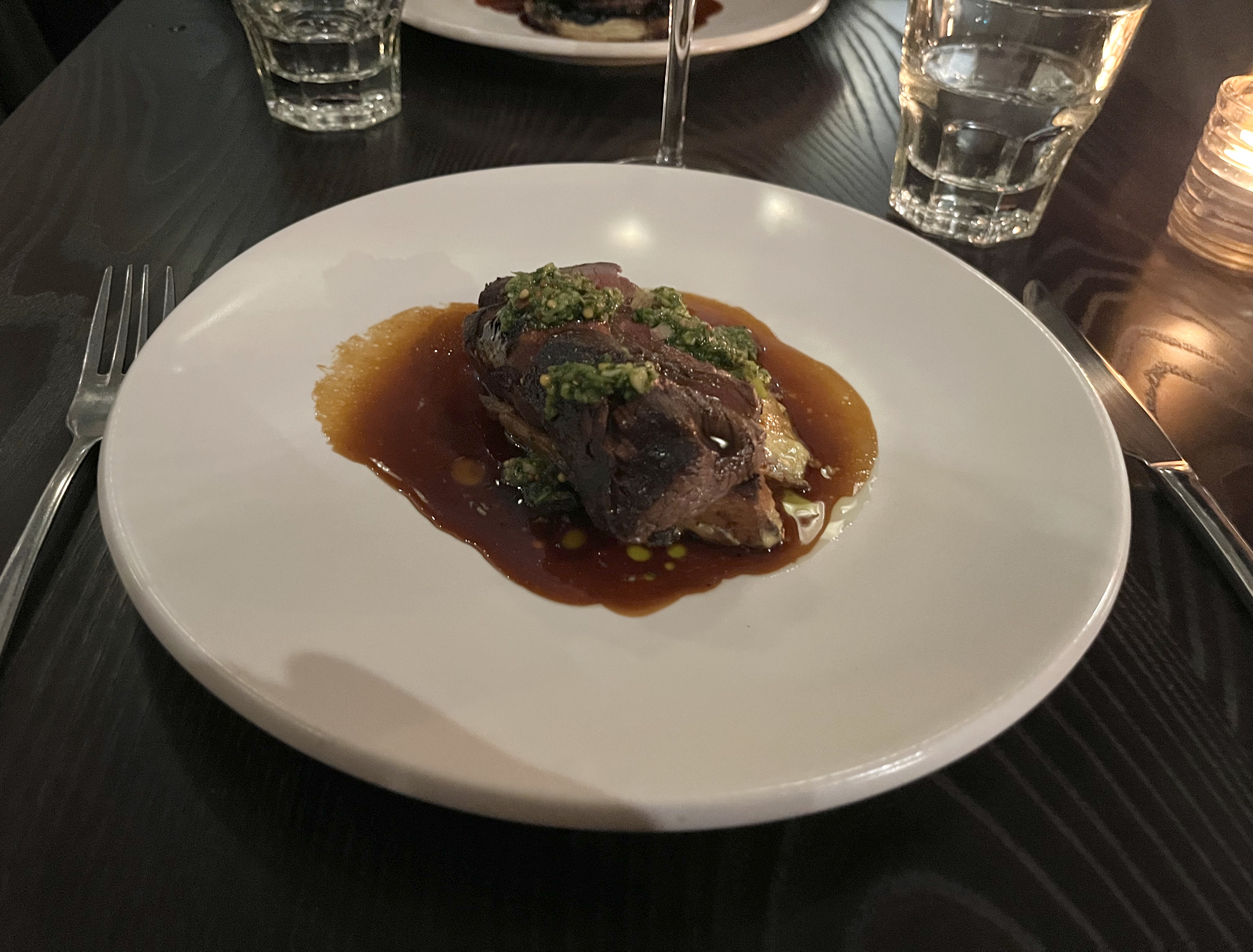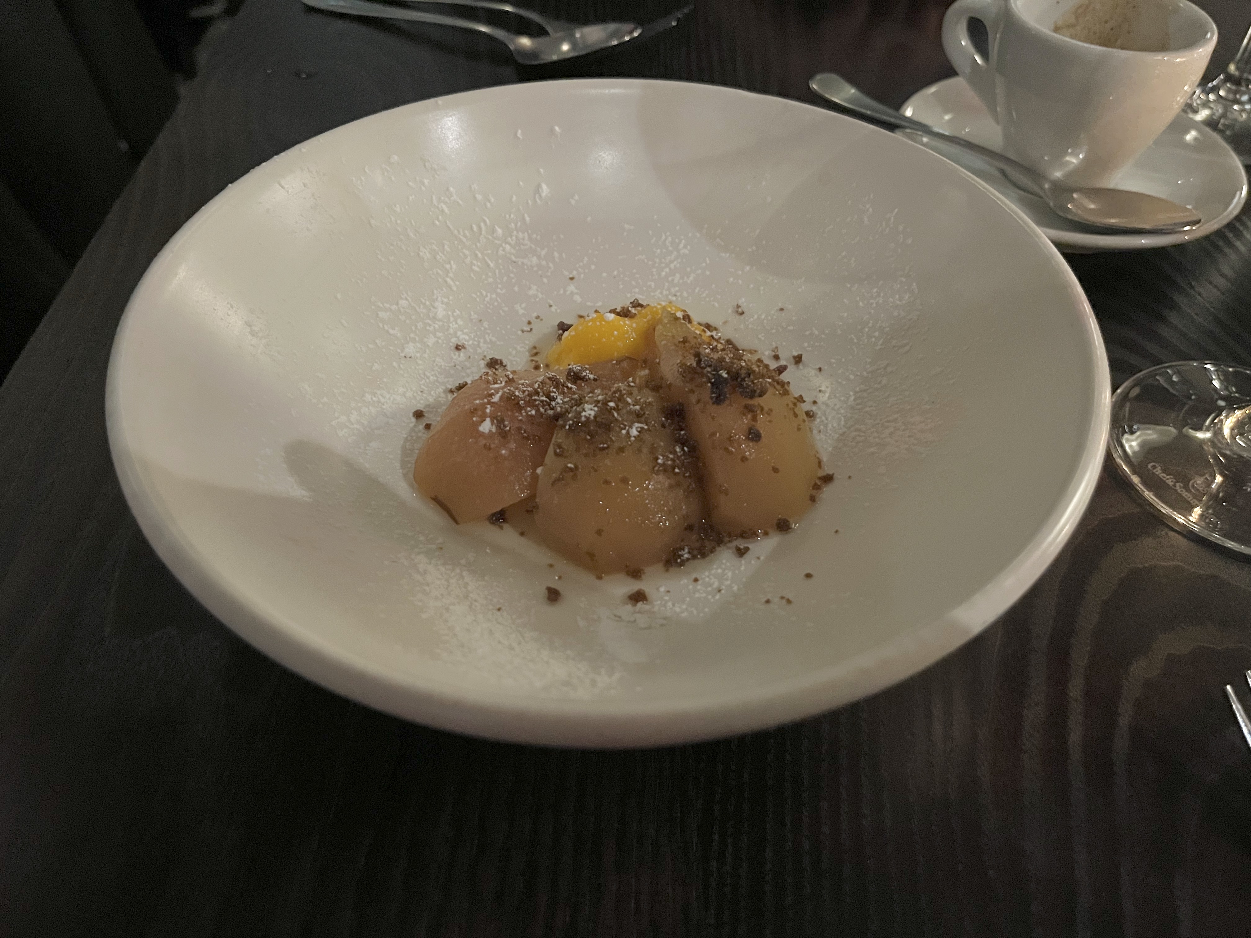 Wellington on a Plate has started, and we had our first taste on Thursday when we had dinner at Capitol. The festival dish was a crayfish soufflé with housemade salmon roe and gem lettuce salad, but unfortunately my picture was of too poor a quality to use. However, I can assure you it tasted fantastic. The main course was seared venison loin with porcini, potato gratin and salsa verde and dessert honey-poached pears with ginger crumble and lemon curd. A glass of pinot gris with the first course and a syrah with the main completed the experience.