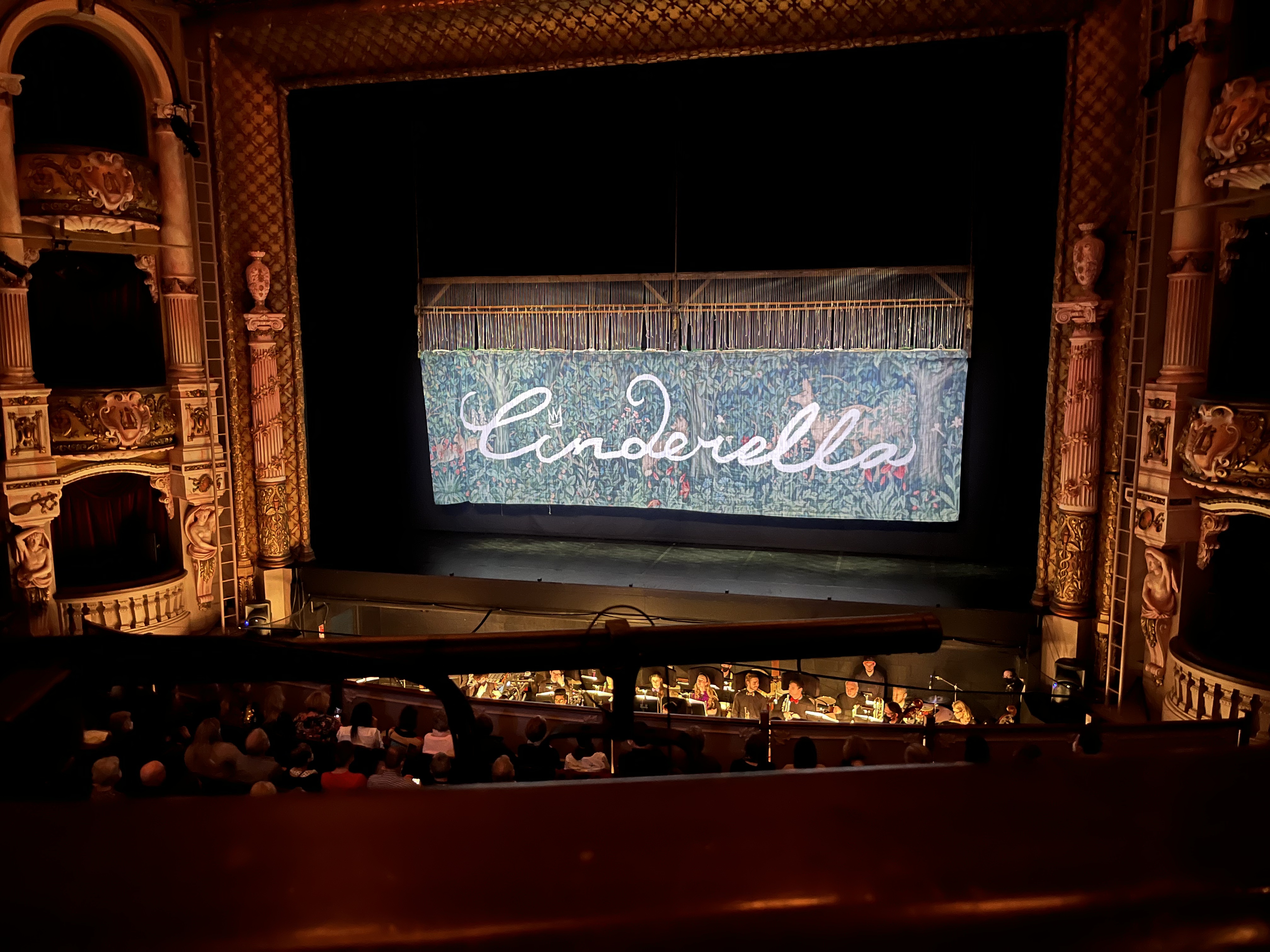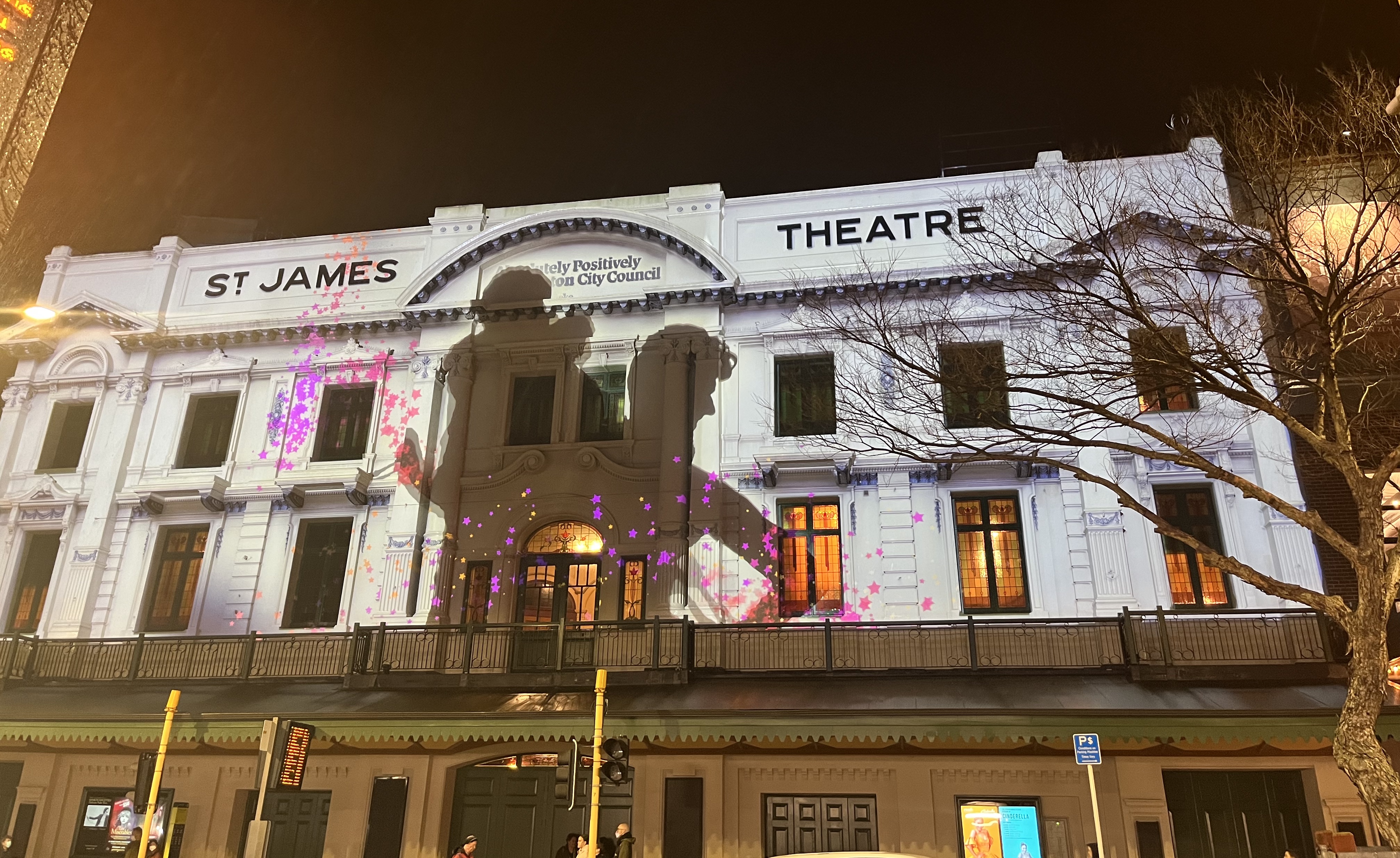 Then to what is probably the highlight of the week – a return to the newly earthquake strengthened St James Theatre to see the Royal New Zealand Ballet’s new production of Cinderella. It was such a fun production with choreography by Loughlan Prior, music specially composed by Claire Cowan and costumes and sets by Emma Kingsbury. While retaining the key elements of the story such as the step-sisters, glass slipper and fairy godmother, there were many different aspects in this production: the Fairy Godmother has helpers known as The Fab Five, Cinderella falls in love with the Royal Messenger, and Prince Charming, helped by the Fairy Godmother, unites with Prince Dashing. The costumes and sets were fabulous, and all in all it was a wonderfully magical evening. There were even projected images on the outside of the theatre.
