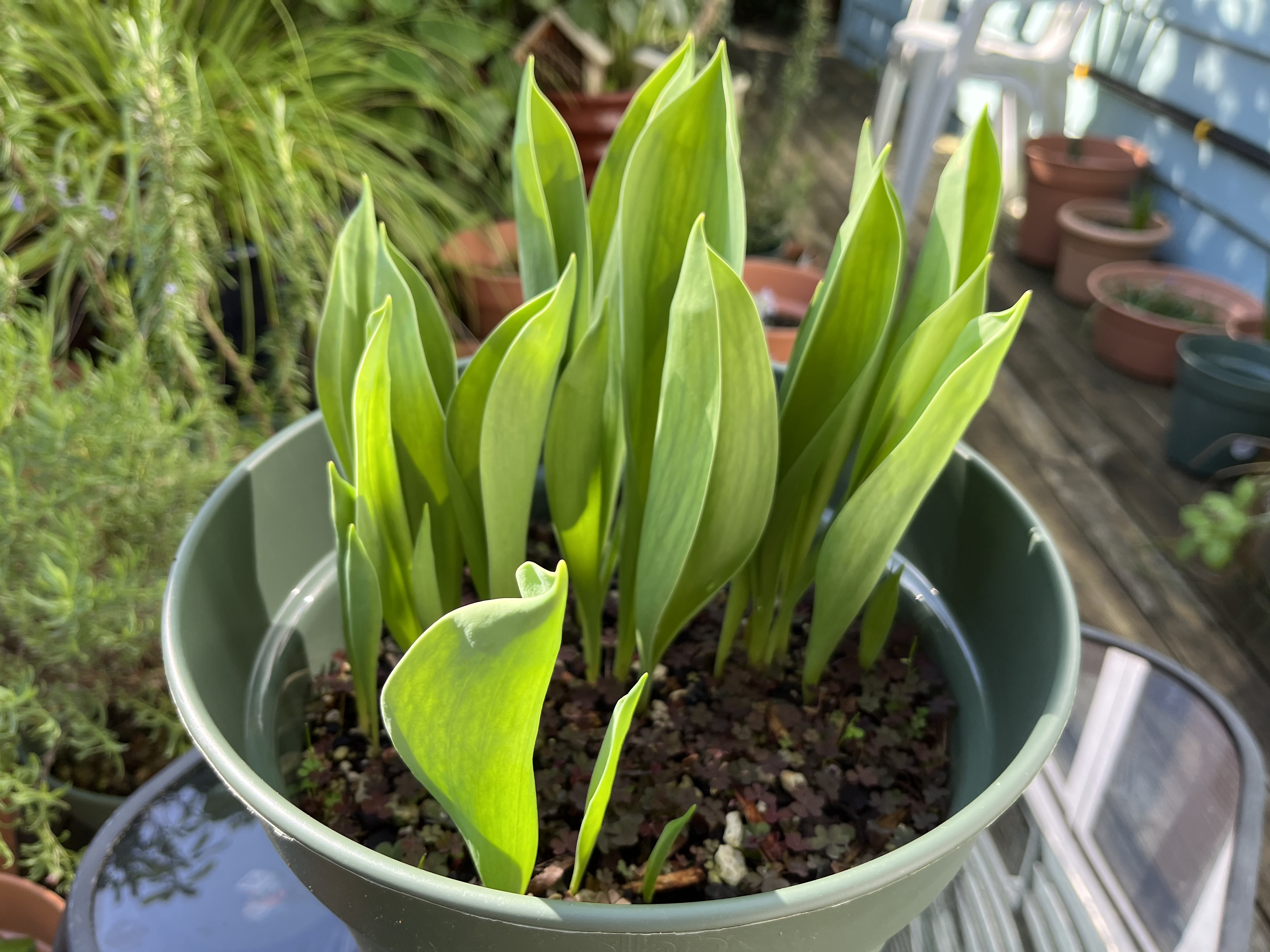 Lots of bulb action going on – these tulips for example. The hyacinth in a glass experiment has produced one soon to flower bulb, the other two I have just stuck in a pot and if they come up, they come up.