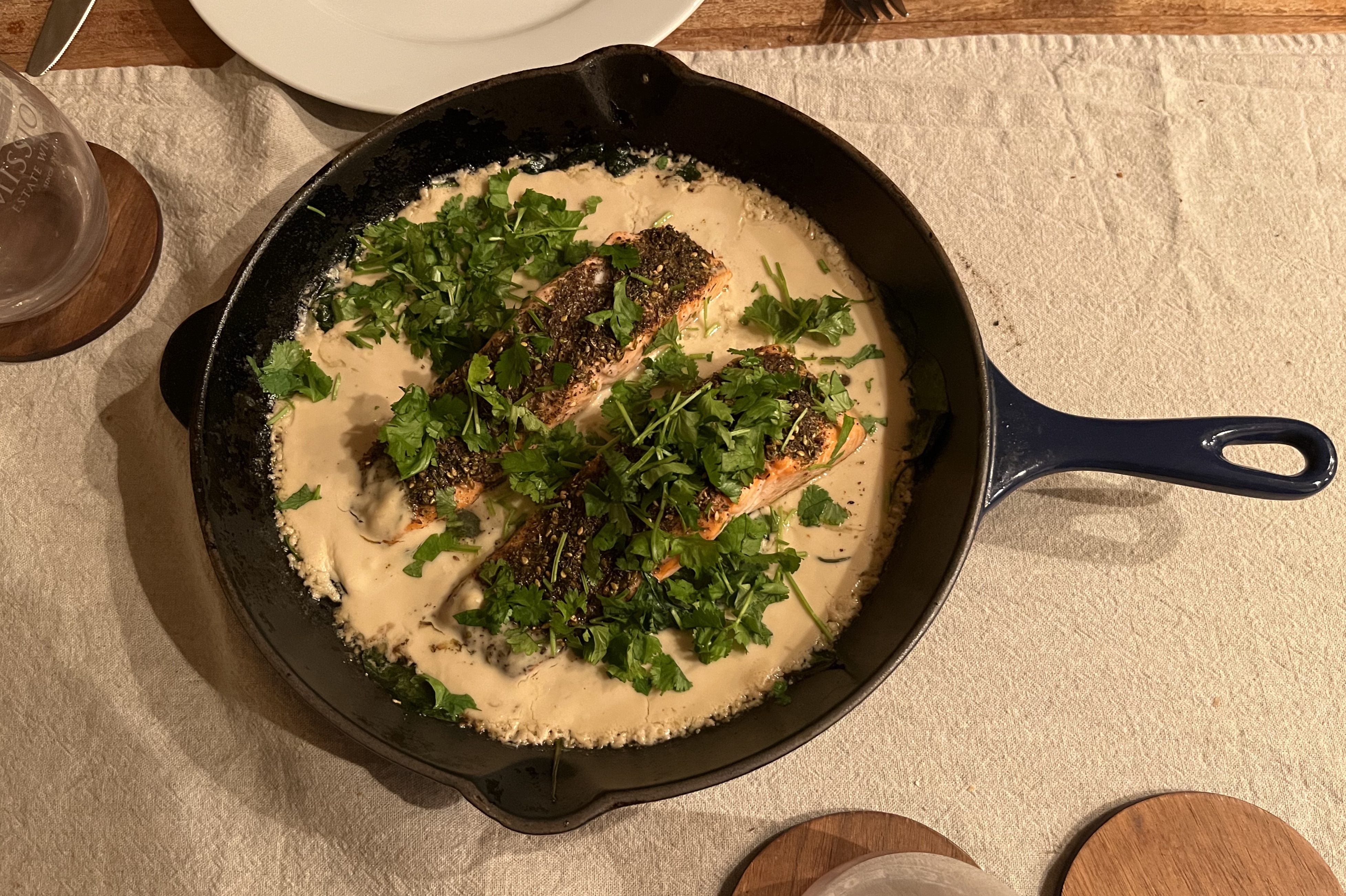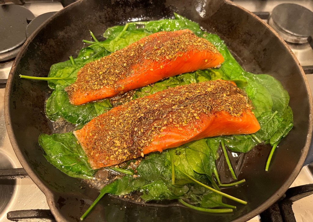 Quite simply, you make a rub or crust from za’atar, sumac and a drizzle of olive oil for the salmon. Add some oil to a frying pan that can go in the oven (I’ve had this Le Creuset one for years), wilt the spinach, add the fish, then pop in the oven for 5 minutes. Add the tahini mixed with lemon juice and water, cook for another 5 minutes and that is it. Sprinkle with coriander and serve.