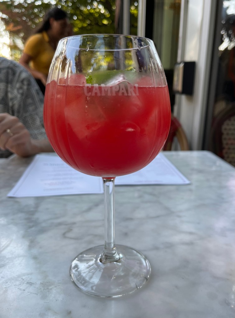 This is a family visit, not just a holiday, so there are meals at home and few chances to eat out. We did have pre-dinner cocktails one evening, an interesting watermelon Campari spritz, and I tried this very locally brewed peach wheat beer.