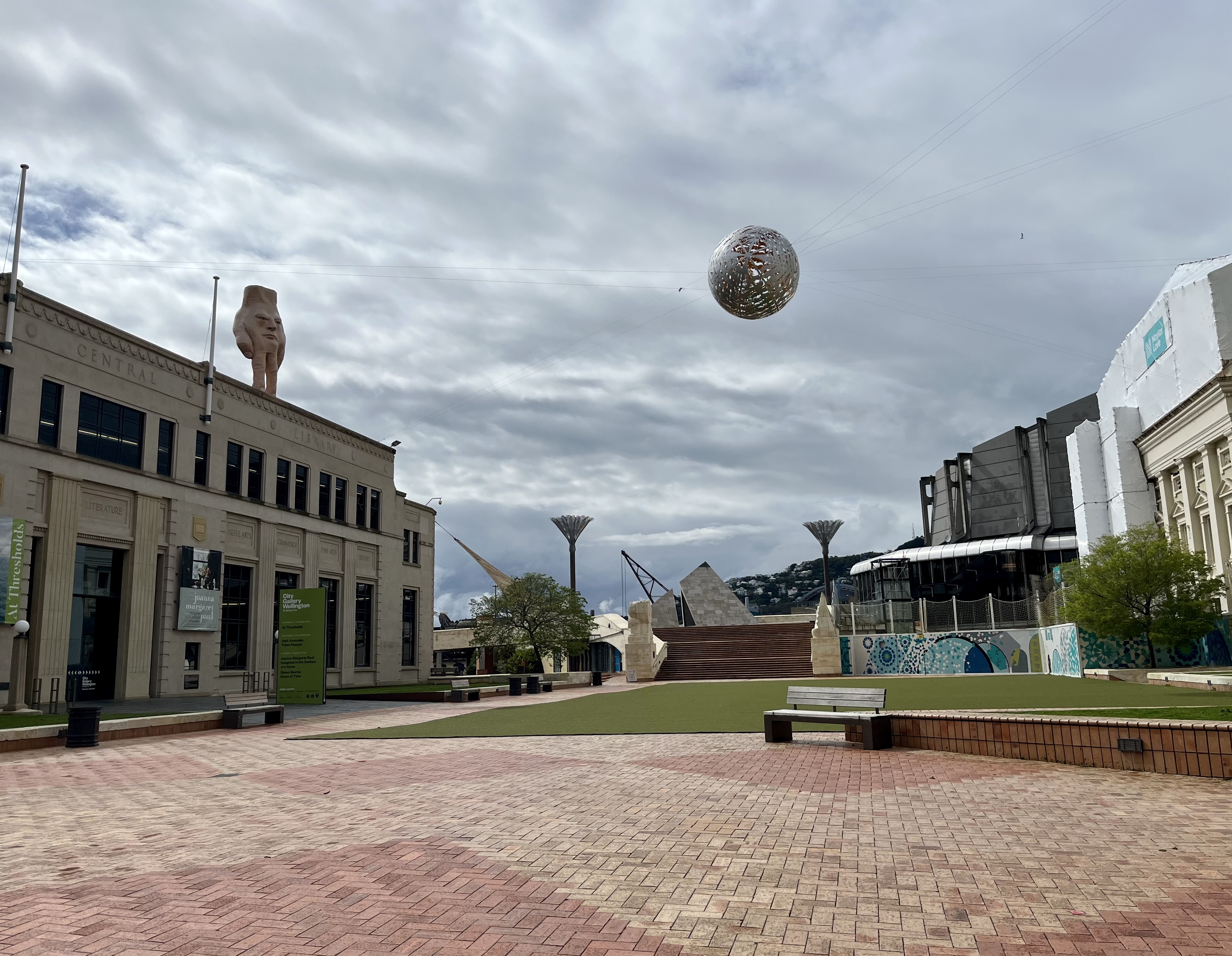 On Wednesday I went to the City Art Gallery, pictured below on the left with the giant hand (Quasi by Ronnie van Hout) on the roof. The gallery is housed in what used to be the central library building in Civic Square. My goal was to see the the Joanna Margaret Paul exhibition Imagined in the Context of a Room, covering her career from the 1970s to the 2000s. I loved her pictures of the ordinary and the mundane, such as a pile of dishes drying by a kitchen sink. I’ve put a couple of her works below to give you an idea.