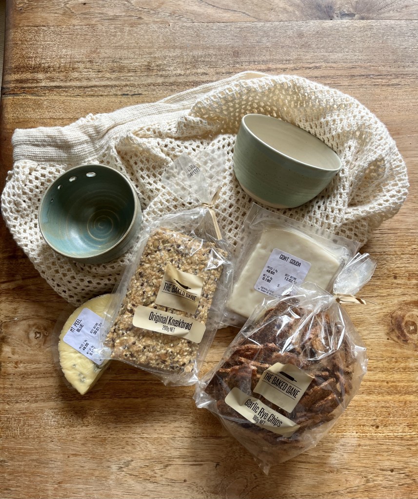 We picked up bratwurst with sauerkraut and mustard for lunch, and spotted Tree walking about. We somehow missed the Morris dancers though, always a favourite of mine. In any case, it was great to be at the fair again after it was cancelled last year. I picked up a few things of course: some stocking fillers which I can’t show (just in case!), two pieces of cheese from Geraldine Cheese Co and some crackers from The Baked Dane and this lovely little bowl from Galit Maxwell and what I hope will be useful, a bowl with holes for pulling leaves off herb stalks – I’ll experiment and let you know how that goes.