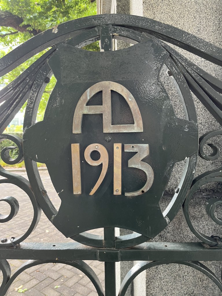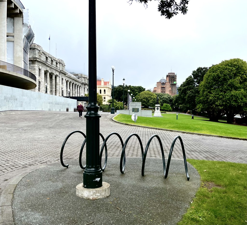 Walking to Pilates on Saturday, I was diverted again thanks to road works (pedestrians seem to come at the bottom of the pile after cars and cyclists) and had to take a detour through the grounds of Parliament. At that time of the morning the sun was yet to come out (as it did later), but you can see the edge of the Beehive, Parliament House, the Parliamentary library (with the red roof) and the pink building in the near distance is the Wellington Cathedral of St Paul’s. The park are is open to all, though I did notice that since the occupation of the grounds by anti-vaxxers and others earlier this year there are posts put up to stop vehicles getting into the area. I love the design on the gates, so much of their time.