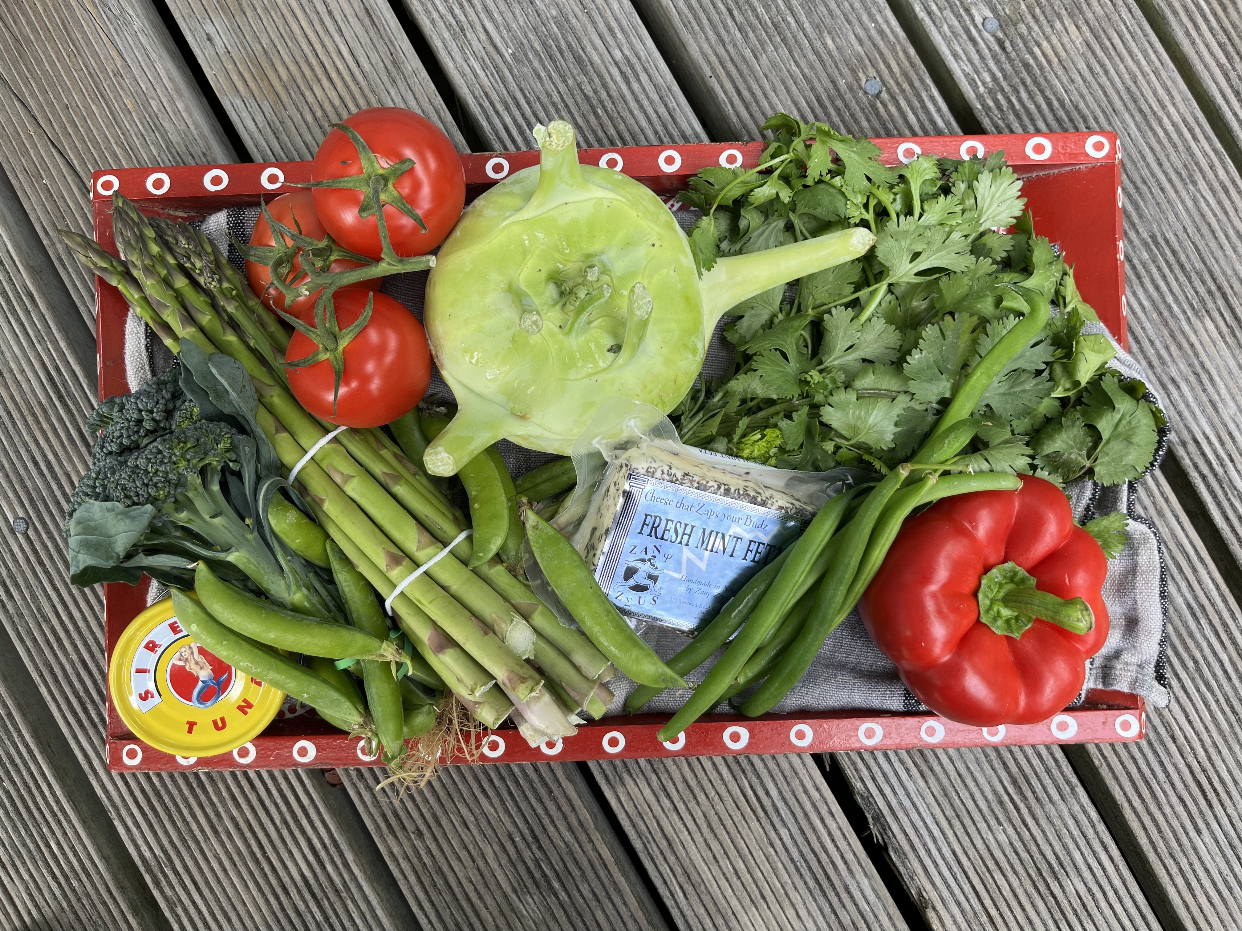 In the basket this week: tomatoes, a kohlrabi for some sort of salad, a bright red capsicum, peas, beans asparagus, broccolini, and a bunch of coriander. There was also feta, some of that nice tuna which is always good to have to hand and of course, a punnet of strawberries. I also had to pick up some more cherries today.