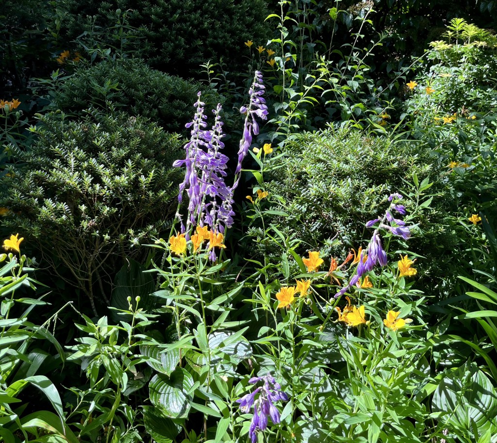 At this time of year, we are welcome home by the golden yellow of the alstroemerias and the purple blooms of the hosta. Such a glorious sight, even when the rain is pouring down.