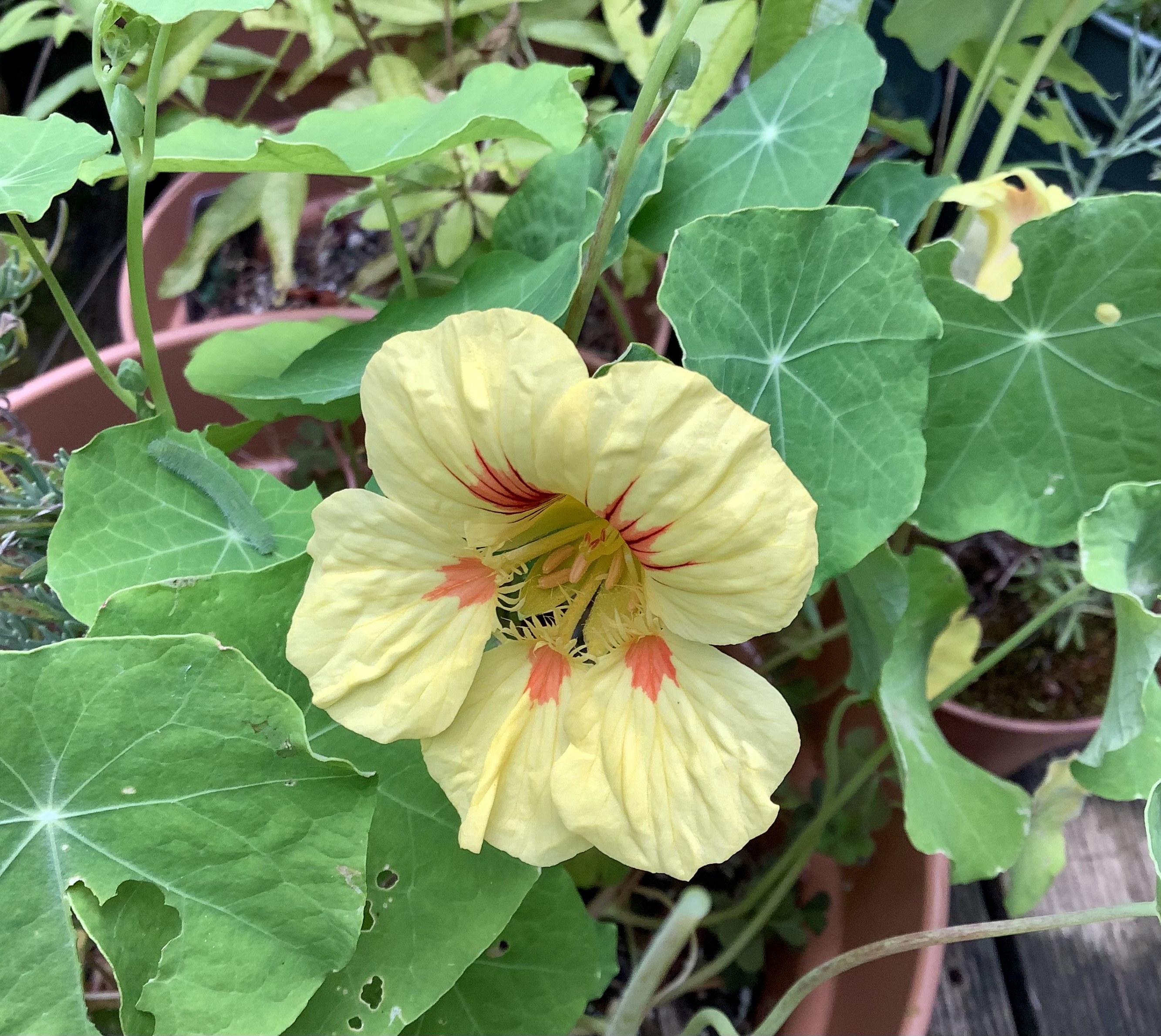 You have a nice collection of nasturtiums ! Enjoy the flowers and capers while the caterpillars are busy with the leaves. What will you do with that pot filled with stones ? Just for the pleasure of the eyes?