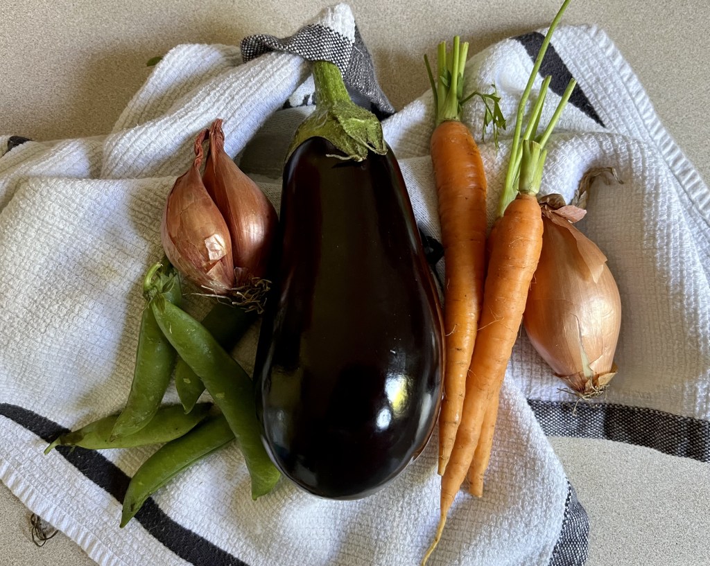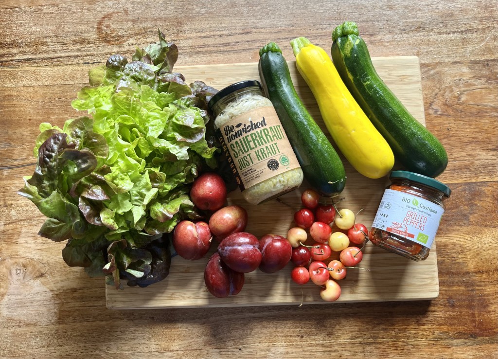 I didn’t go back to work until Thursday, so had a few days last week to enjoy messing about in the kitchen (see Wednesday’s post). On Wednesday, I picked up a head of lettuce, some green and yellow courgettes which I will use today with pasta, a small bag of white cherries as a real special treat, a jar of sauerkraut and one of grilled peppers. I also picked up a few plums. This should be the height of stone fruit season, but the weather in the north has really paid havoc with the harvest, and there isn’t the same choice and amount as usual. Still, I am making the most of what there is. In Saturday’s basket there was this glorious glossy aubergine, peas, baby carrots, shallots, sausages, chicken, and some gurnard which we enjoyed for Saturday’s dinner.