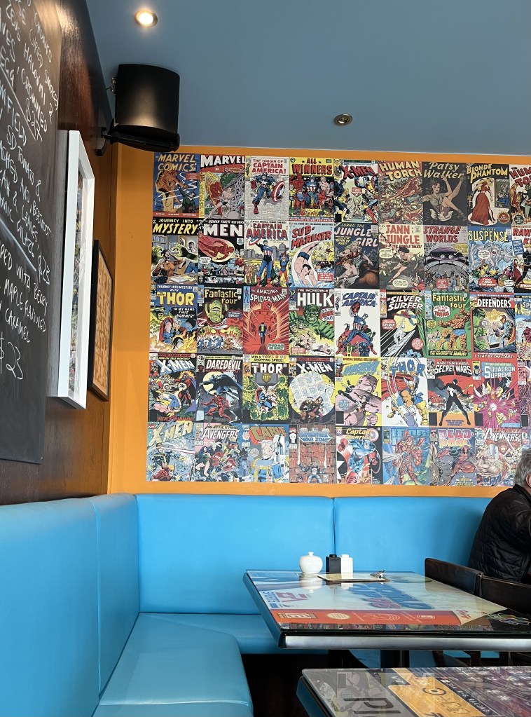 We had lunch at the wonderfully named Scorch-O-Rama, the walls of which are covered in old comic covers. It has been ages since we had been there so it made a nice change to visit again. I had The Bennyfishiary, a smoked salmon eggs Benedict and Karl the nachos, both of which we enjoyed.