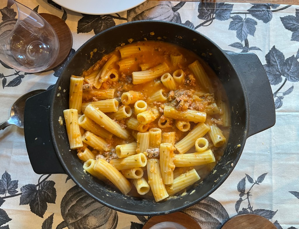 Well, I couldn’t get the pasta shape she suggested, so just went for rigatoni, which is at least a tube pasta of sorts. Then because of all the disruption to the supply chain thanks to Cyclone Gabrielle, pork mince was in short supply, but I did find some that already had added herbs which I figured wouldn’t matter (and it was from Woody’s Free Range).