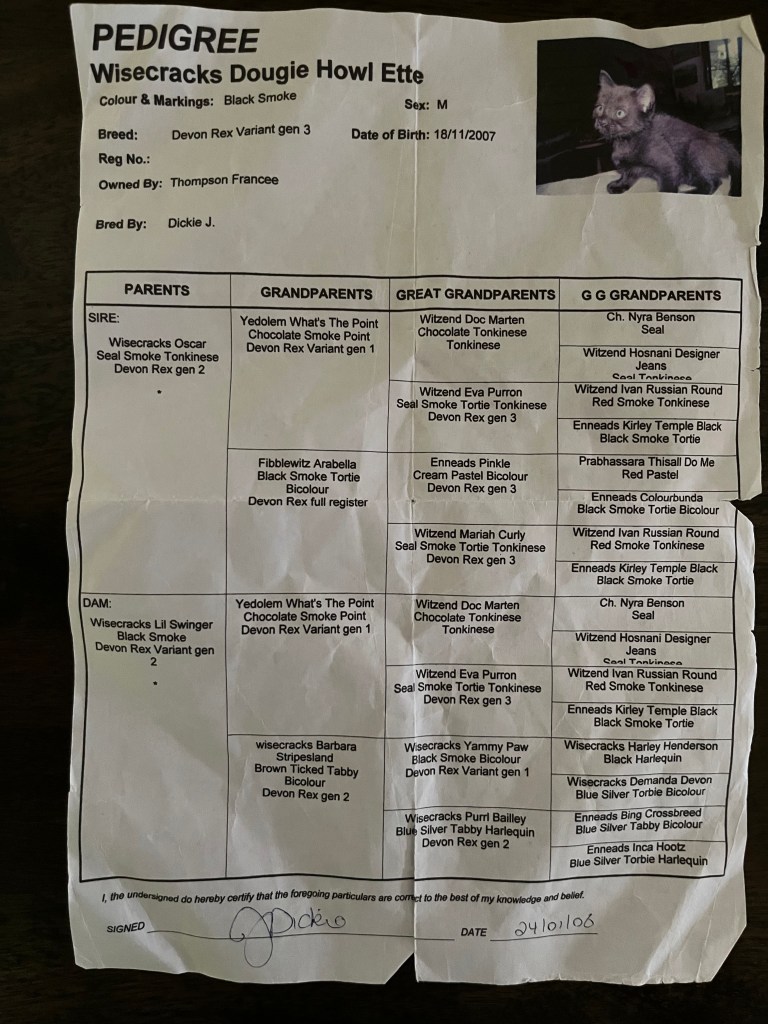 Charlie, or to give him his full name. Wisecracks Dougie Howl Ette, actually had a pedigree. With a lot of Devon Rex in him, he was a smart, attention seeking cat who was both affectionate and the boss. He first lived in the Newtown suburb of Wellington, but fell out when his owner had a baby. So he walked 8km to find a new home in Northland. His lovely owners (who we met and kept in touch with) went on an extended trip to Europe, leaving him in a cattery he didn’t like. He fell out with them because of that. His constant fascination with Kelburn led him to spend a lot of time on this side of the valley, eventually deciding that we were the humans he wanted to live with and becoming head of the household. Below you can see his heritage and what I always thought would be a good passport photograph.