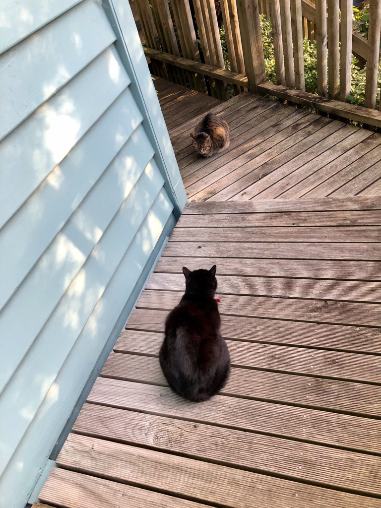 Charlie had lots of friends, mostly human. Indie, pictured with Charlie below was a particular favourite cat friend. They could sit for up to two hours just watching each other, and even sleep in the same house (but in different rooms). Then of course there was, Bodie, a 10kg ginger car who used to live next door. It was fun to watch Charlie hiding and ambushing him, chasing from our garden at great speed.