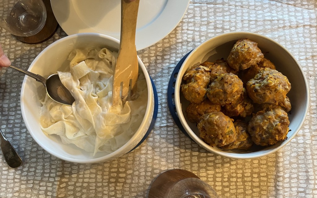 One thing we like in this house is meatballs. Julia Turshen’s wonderful turkey meatballs are a firm favourite and Ottolenghi’s lamb and feta ones, slathered in pomegranate molasses, also appear often on our table. While we rarely nowadays have the classic Swedish köttbullar (traditionally served with creamy brown gravy and lingonberries) except on the Christmas table, they are also ones we enjoy.