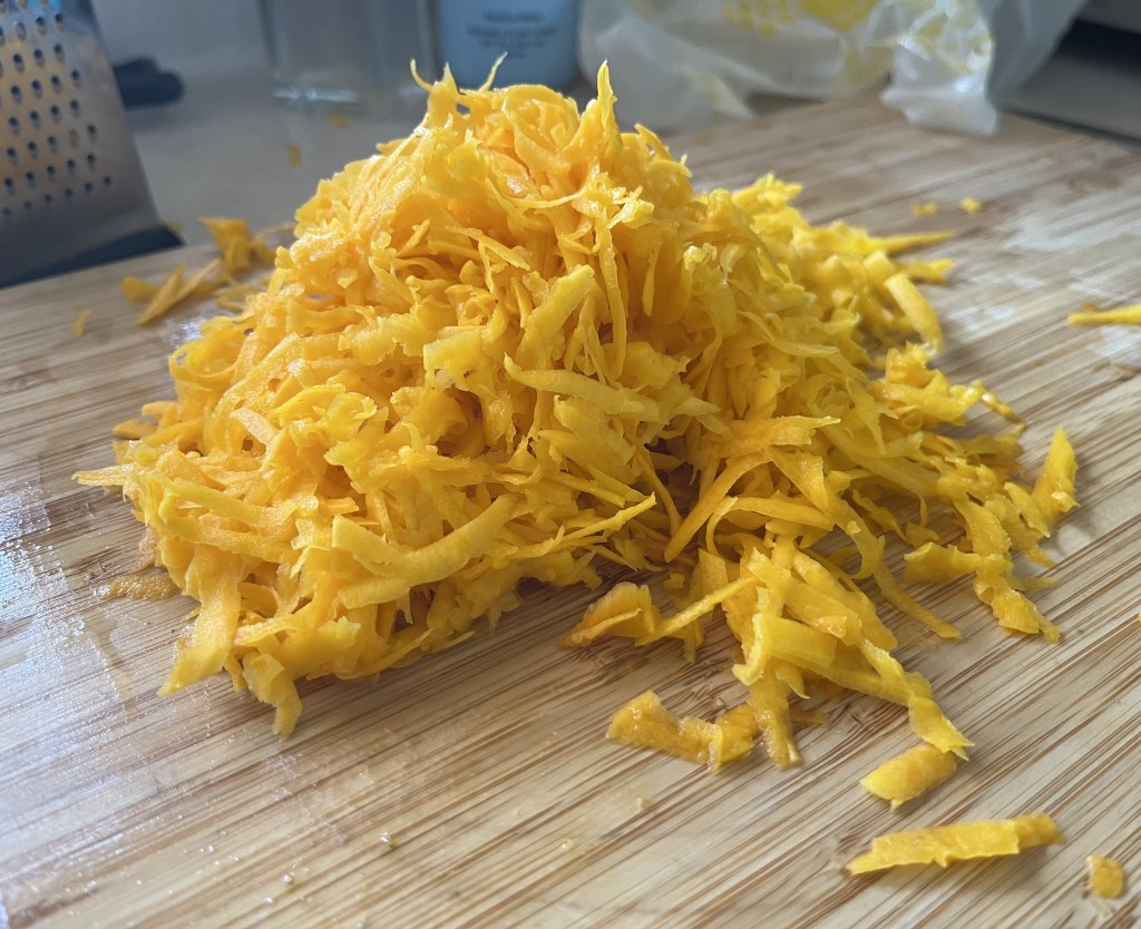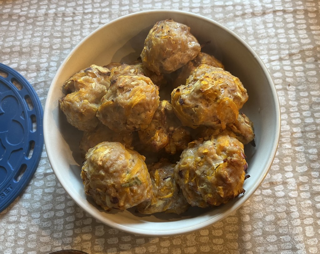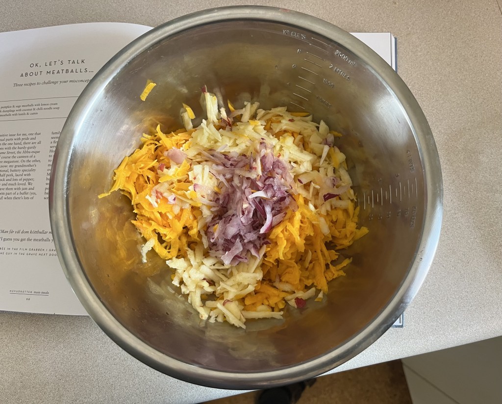 The recipe calls for a mix of grated pumpkin, red onion and apple, mixed with sage, lemon rind, seasoning and pork mince. Flour is added at the end as otherwise the mixture would be extremely wet as you can imagine with all those grated vegetables.