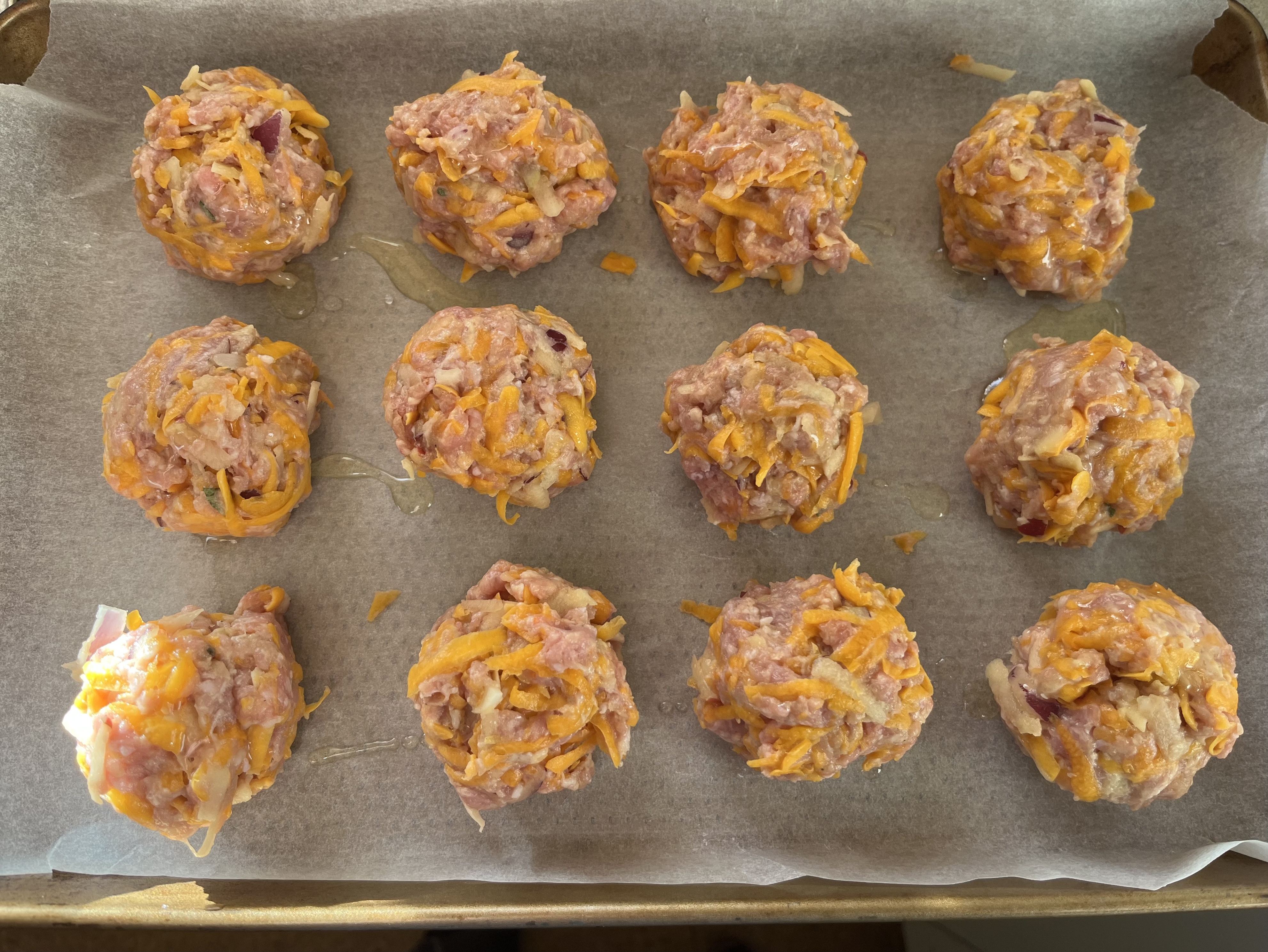 The recipe calls for a mix of grated pumpkin, red onion and apple, mixed with sage, lemon rind, seasoning and pork mince. Flour is added at the end as otherwise the mixture would be extremely wet as you can imagine with all those grated vegetables.