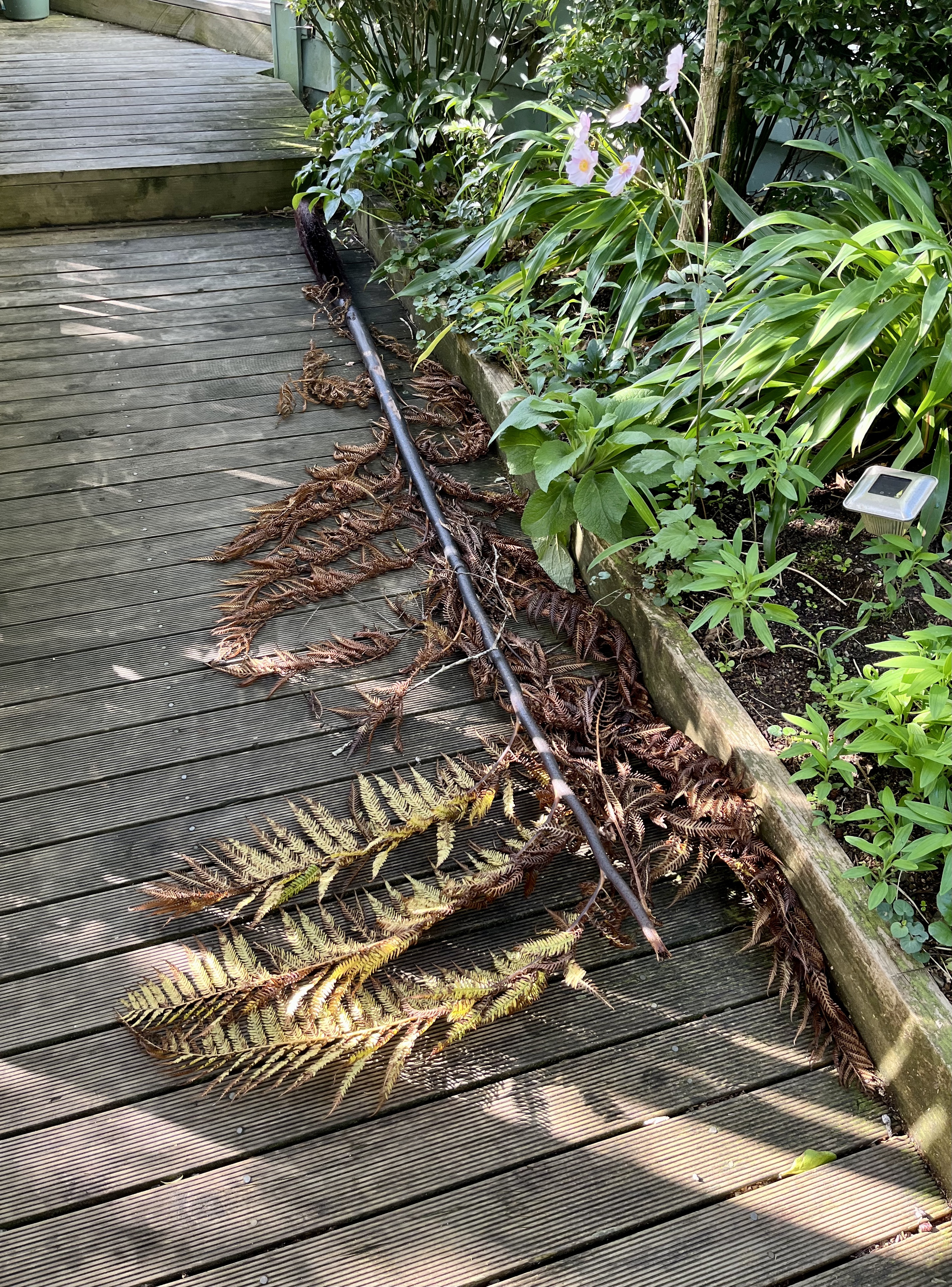 One of the consequences of the weather was…well this large fern branch falling off beside the house, and another one falling on the steps to the house. Luckily, nothing more fell off and there was no damage, just the question of how to dispose of this….