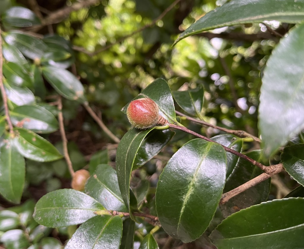 Spotted on the camellia bush that sits between our house and our neighbours’ garden. this fat looking bud. This is always the first one to flower.
