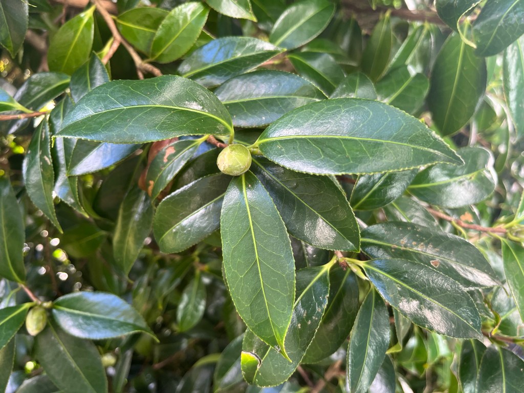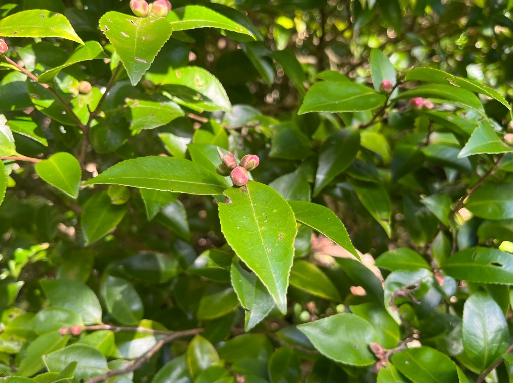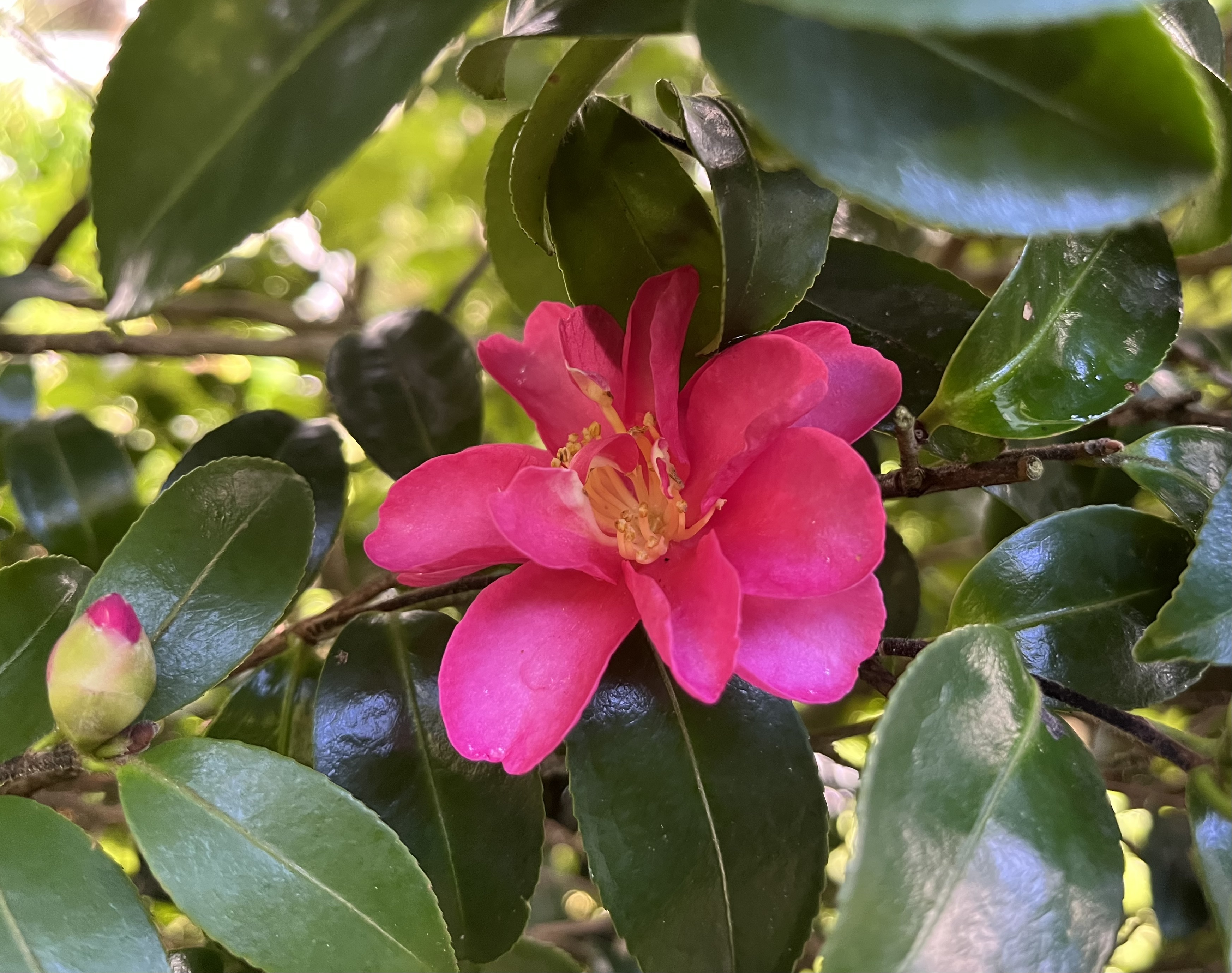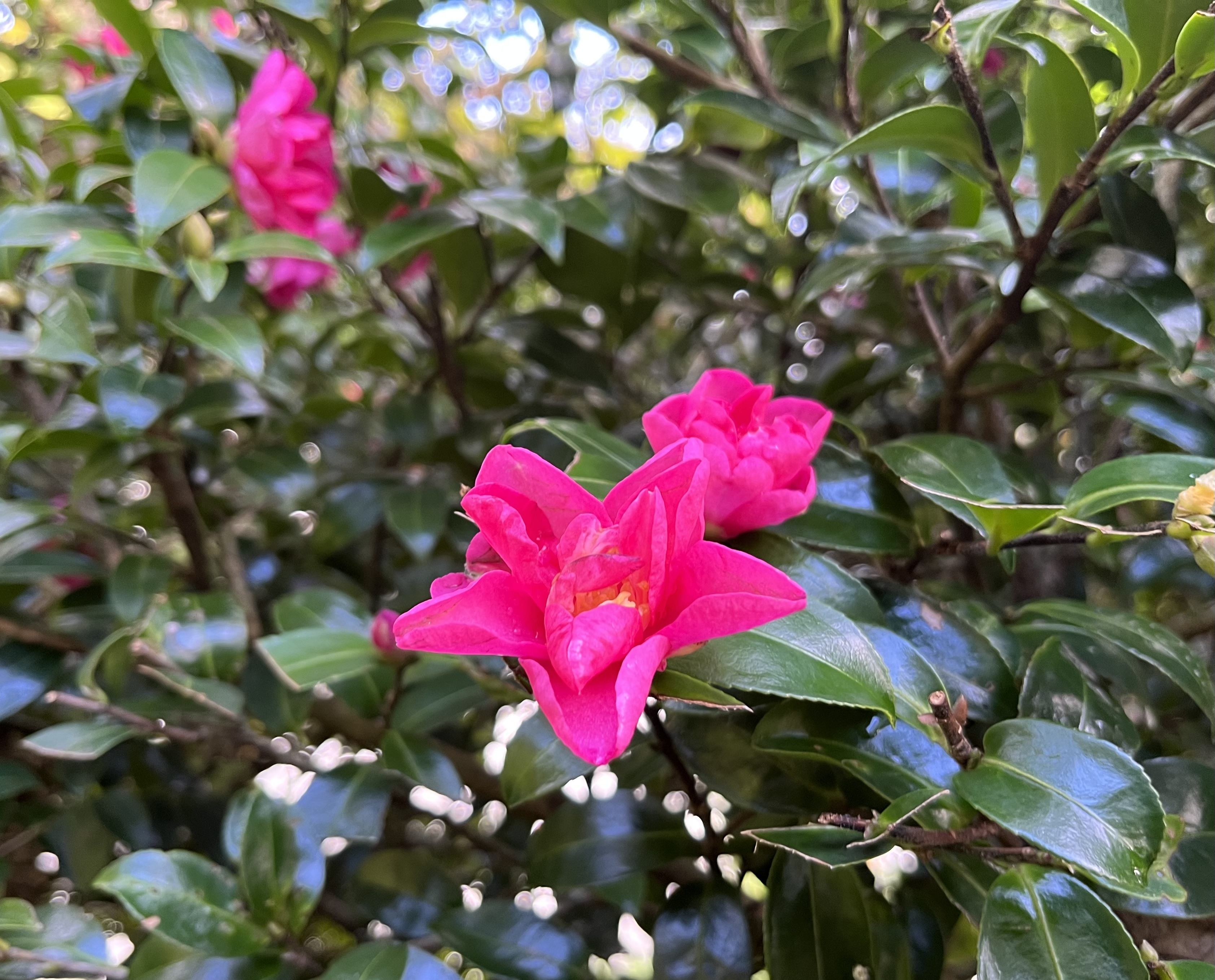 Finally, more camellias, this time the bush in front of the house, covered in buds…and a couple of flowers can also be seen at the top of the bush, contrasting beautifully against the sky.