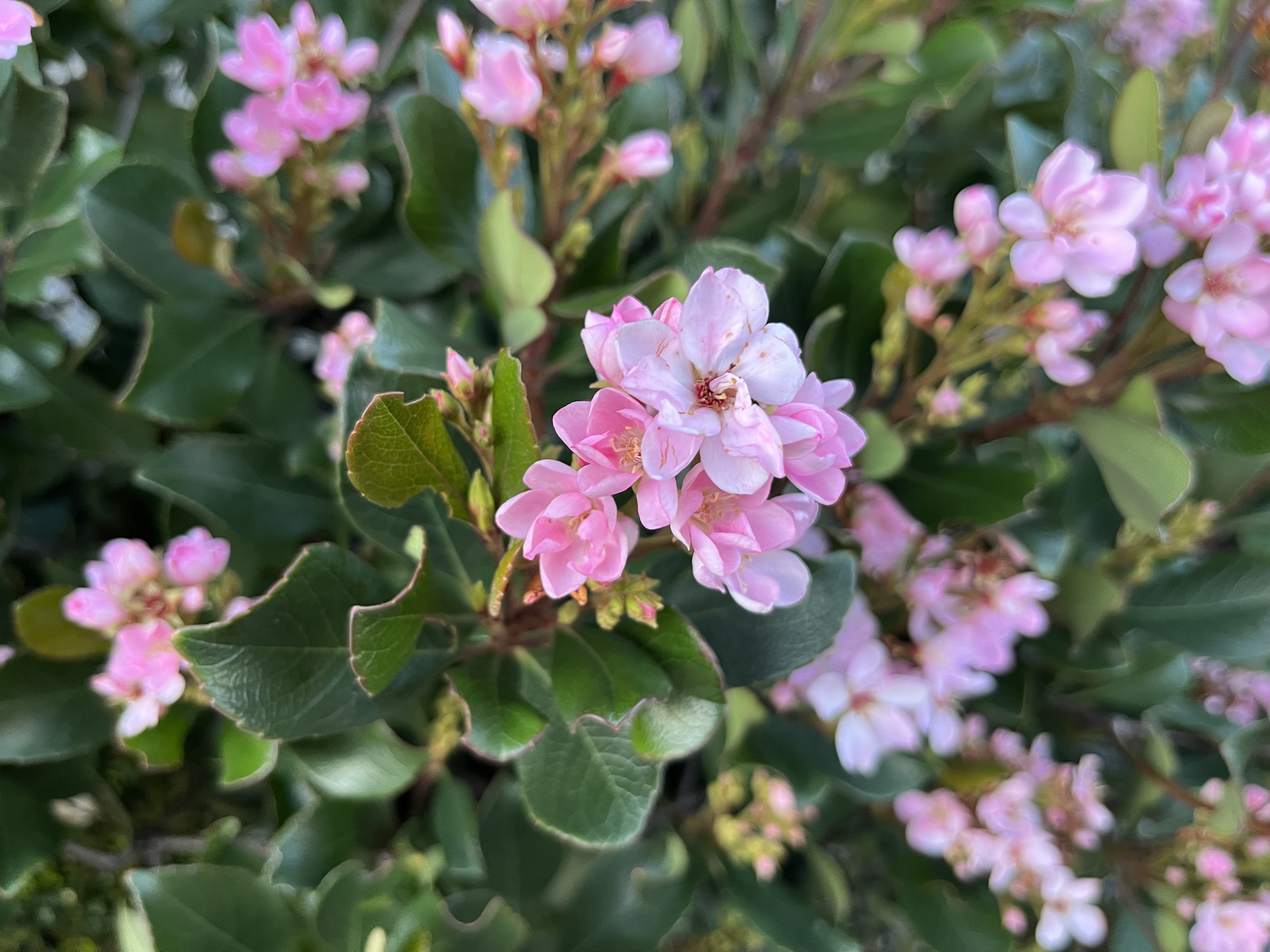 It is Rhaphiolepis indica, the Indian hawthorn – not the same as the native hawthorn in the UK. (I had to look it up!)