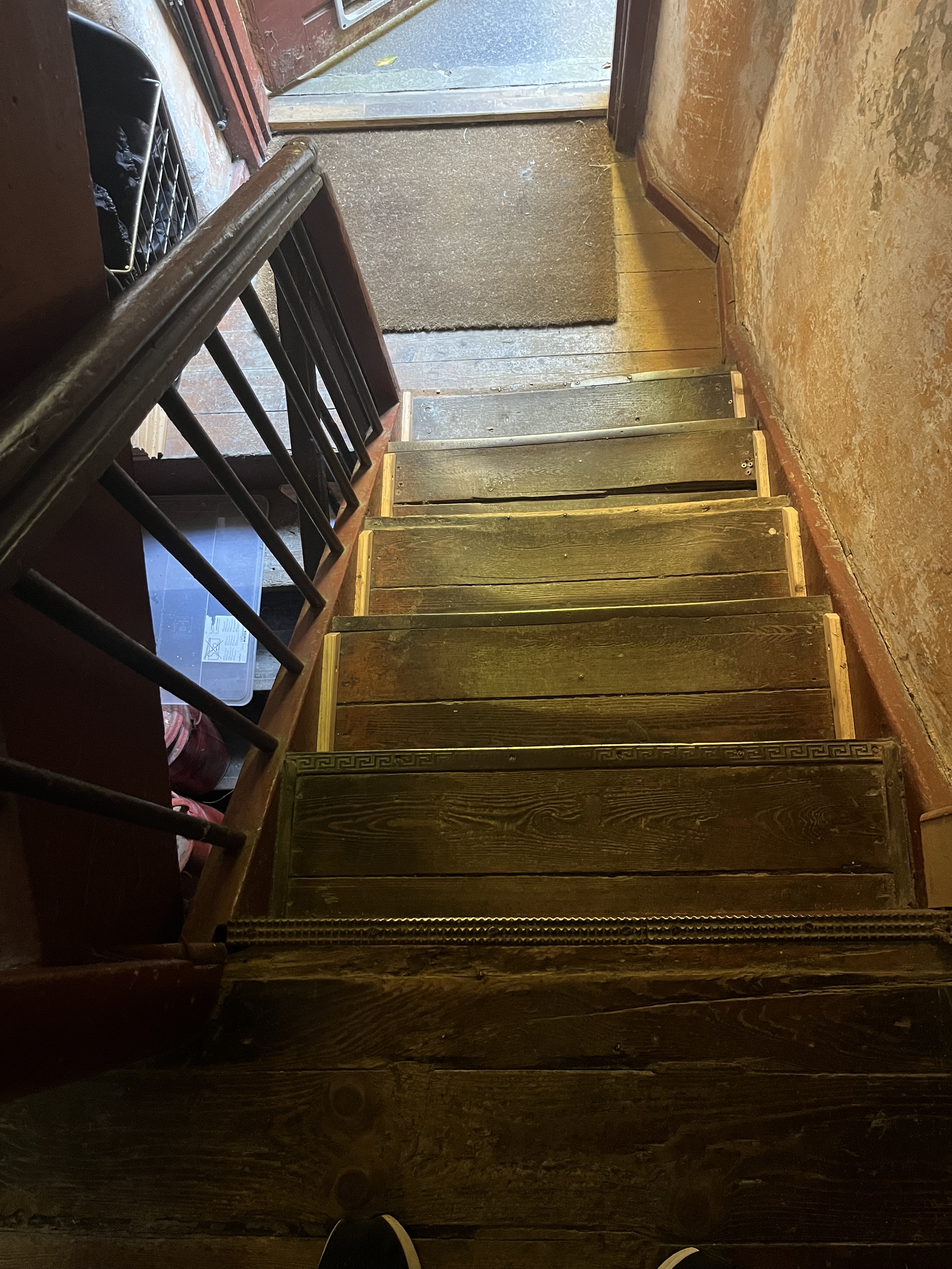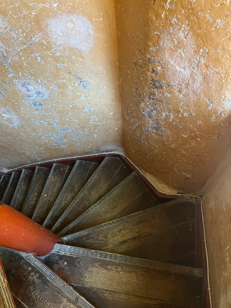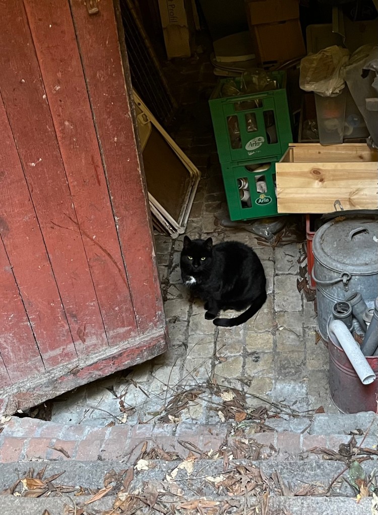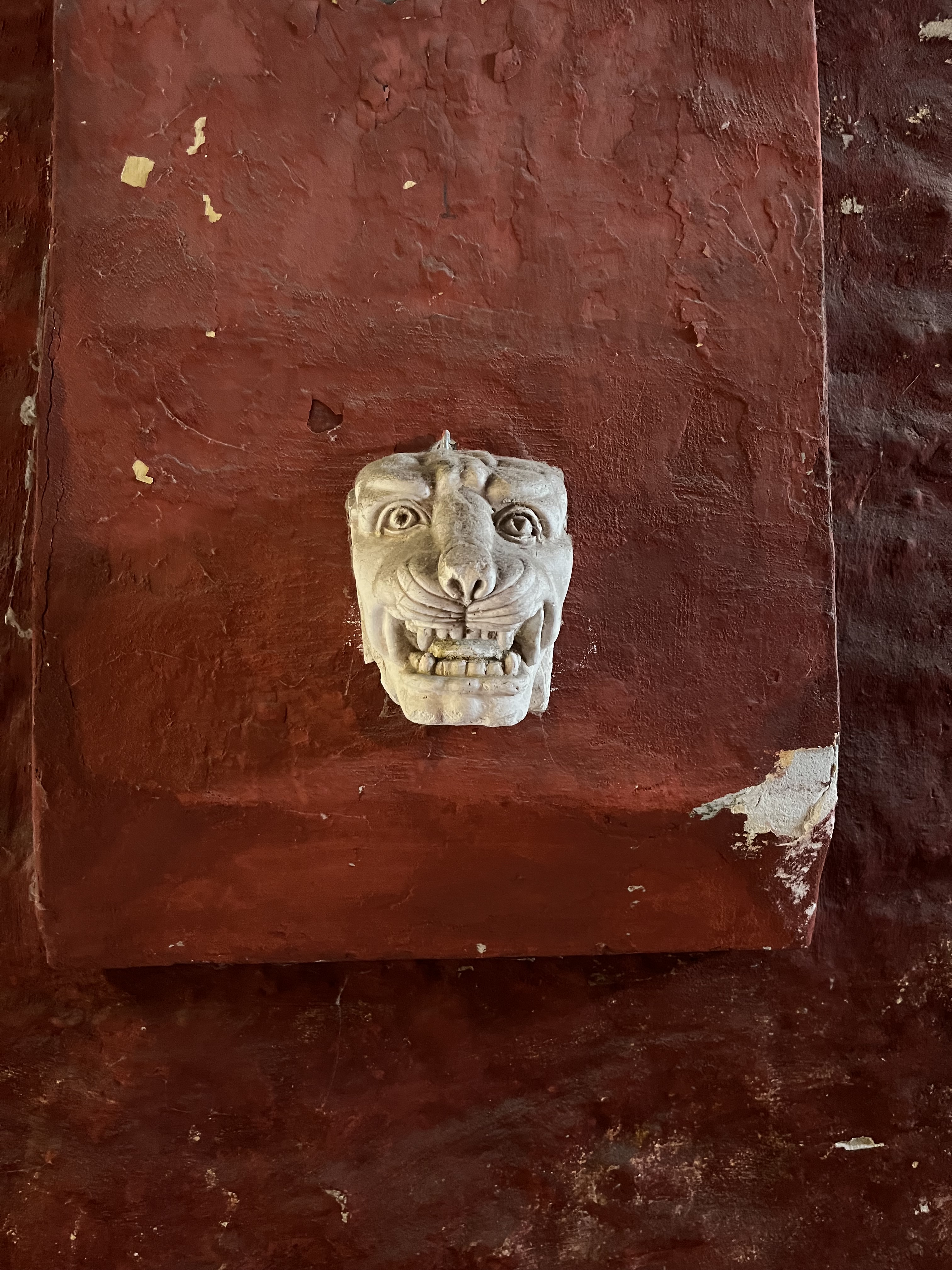 If the steps up to the apartment could tell us stories, I wonder what we would hear? As you can see, they are well worn down and, along with the walls, are testament to the age of the building. The yard is home to a couple of cats, including this gorgeous one below, and a little stone head near the doorway.