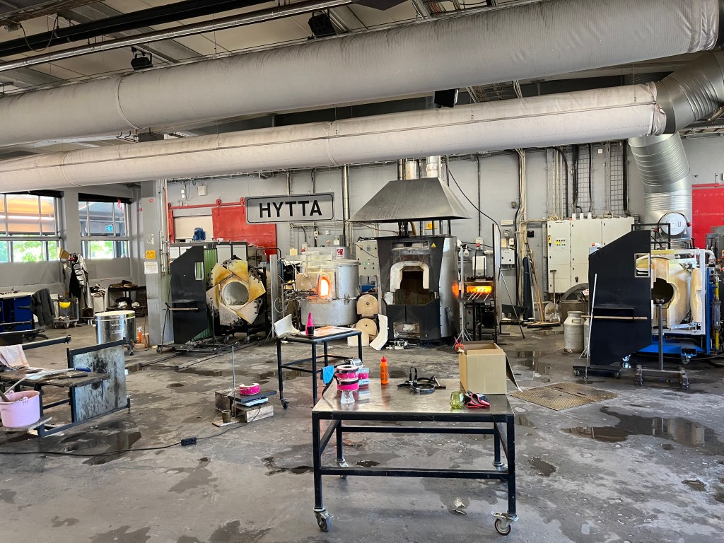 In one of the exhibition halls I spotted these which I thought looked like sausages, but given the colour were most likely glass gherkins. At Kosta, it is also possible to see a demonstration of glass blowing and making, so we sat for a while watching a man at work blowing glass and then using a mould to make drinking glasses. Below you can see the workshop and the museum.