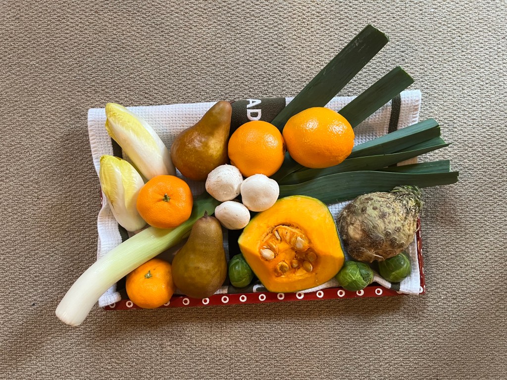 In the basket this week….a leek, a piece of pumpkin, a little celeriac, Brussels sprouts, mushrooms, pears, tangerines and witloof (chicory). There was also a bag of potatoes, a chicken to roast, and some pork and fennel sausages.