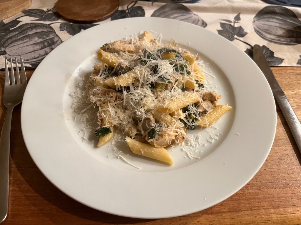 Despite not feeling 100%, I made a proper Sunday roast, making the herbed roast chicken with buttery croutons from Julia Busuttil Nishimura’s Around the Table, my latest cook book purchase. I served it with potatoes, the sprouts and roasted pumpkin and purple carrots – a veritable feast. The left over vegetables made an excellent Monday lunch, topped with cheese and popped in the oven, and the leftover chicken was used to make a pasta sauce with mushrooms for dinner. Apologies for the photos but it is all about the artificial light in the evenings at the moment! And yes the skin did burst open on the roast chicken….and you can find the recipe here.