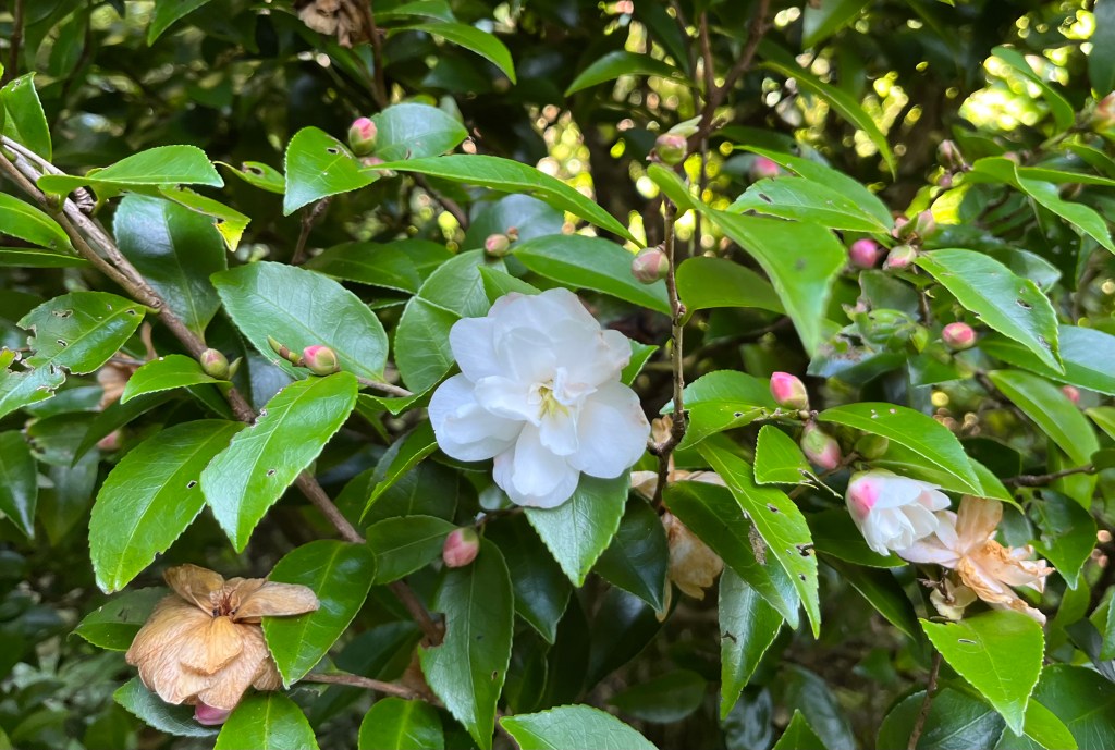 This week is camellia heavy, with no apologies. To start, the little white camellias with their touch of pink are very pretty and delicate – one could imagine the flowers as a fairy’s dress – or is that only me?