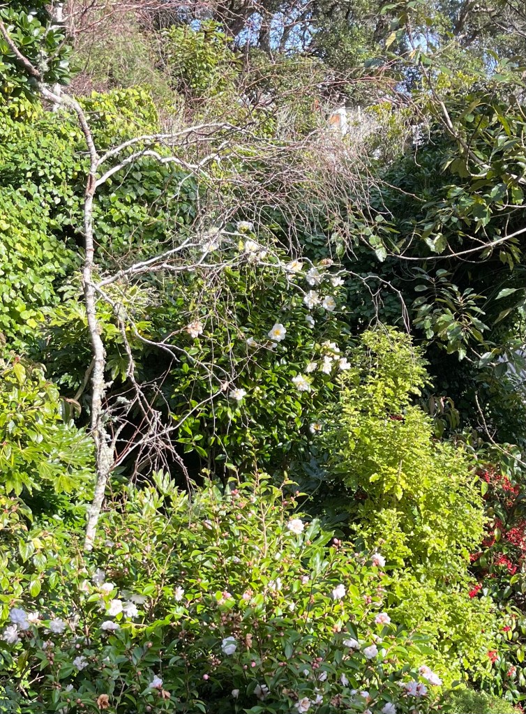 Back to camellias…and the bush with the large, white flowers is looking good but impossible to photograph given its location on the slope. This photo was taken by me leaning out of the box room window.