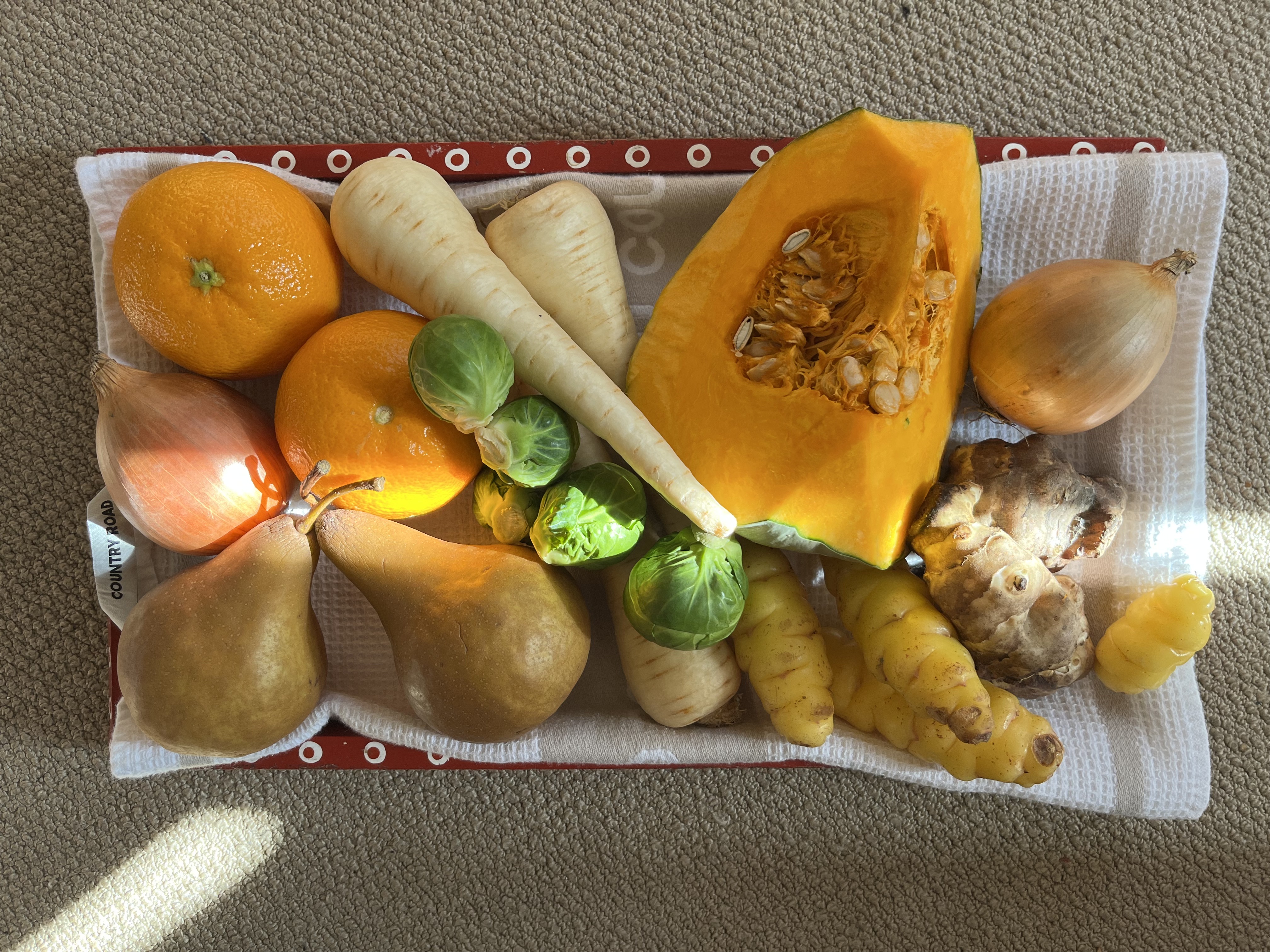 In the shopping basket this week there were lots of seasonal items such as pumpkin, parsnips, Brussels sprouts, yams (oca), oranges and a bag of Jerusalem artichokes for Wednesday’s soup. I also needed onions and picked up some pears for weekday eating.