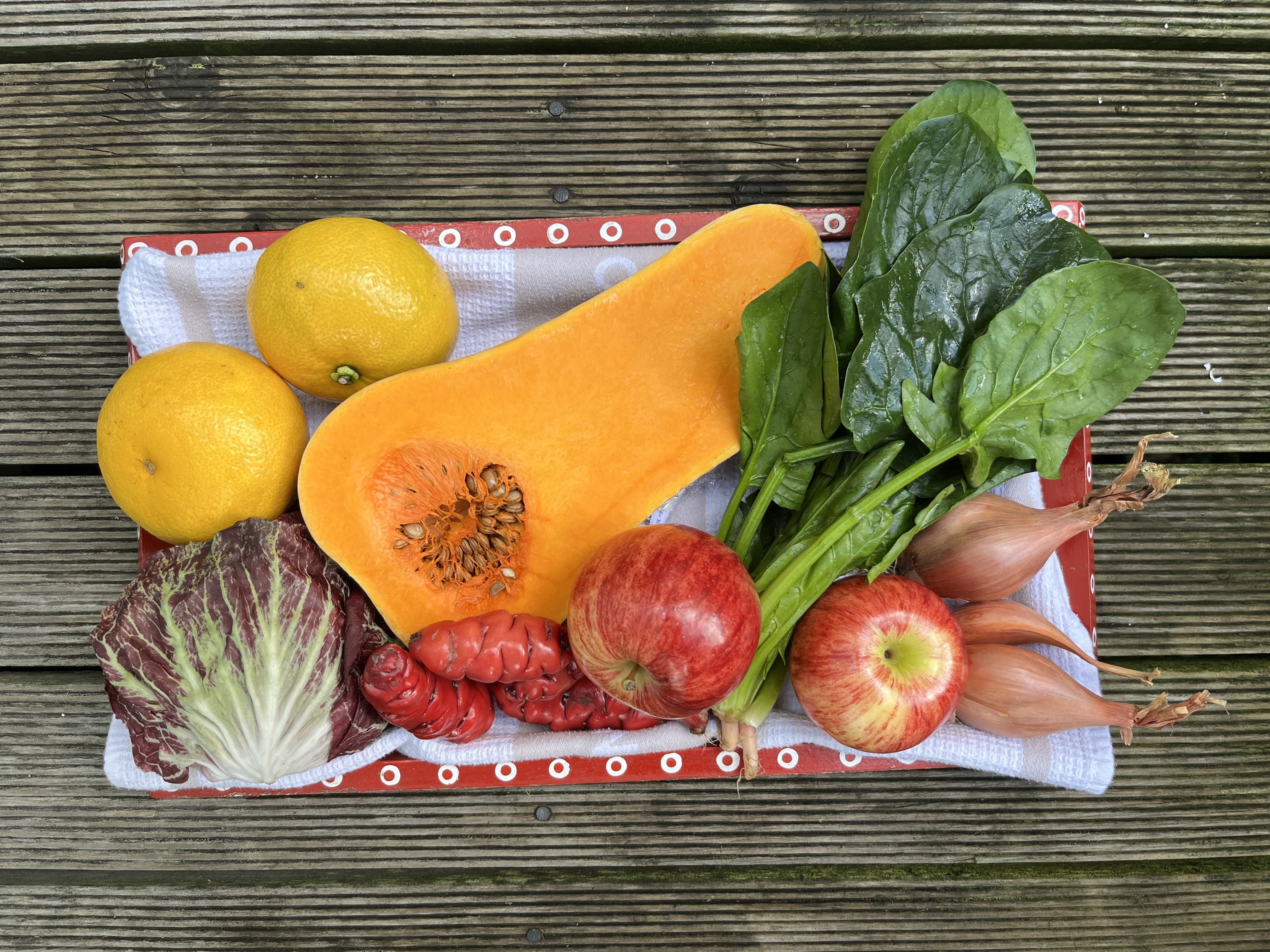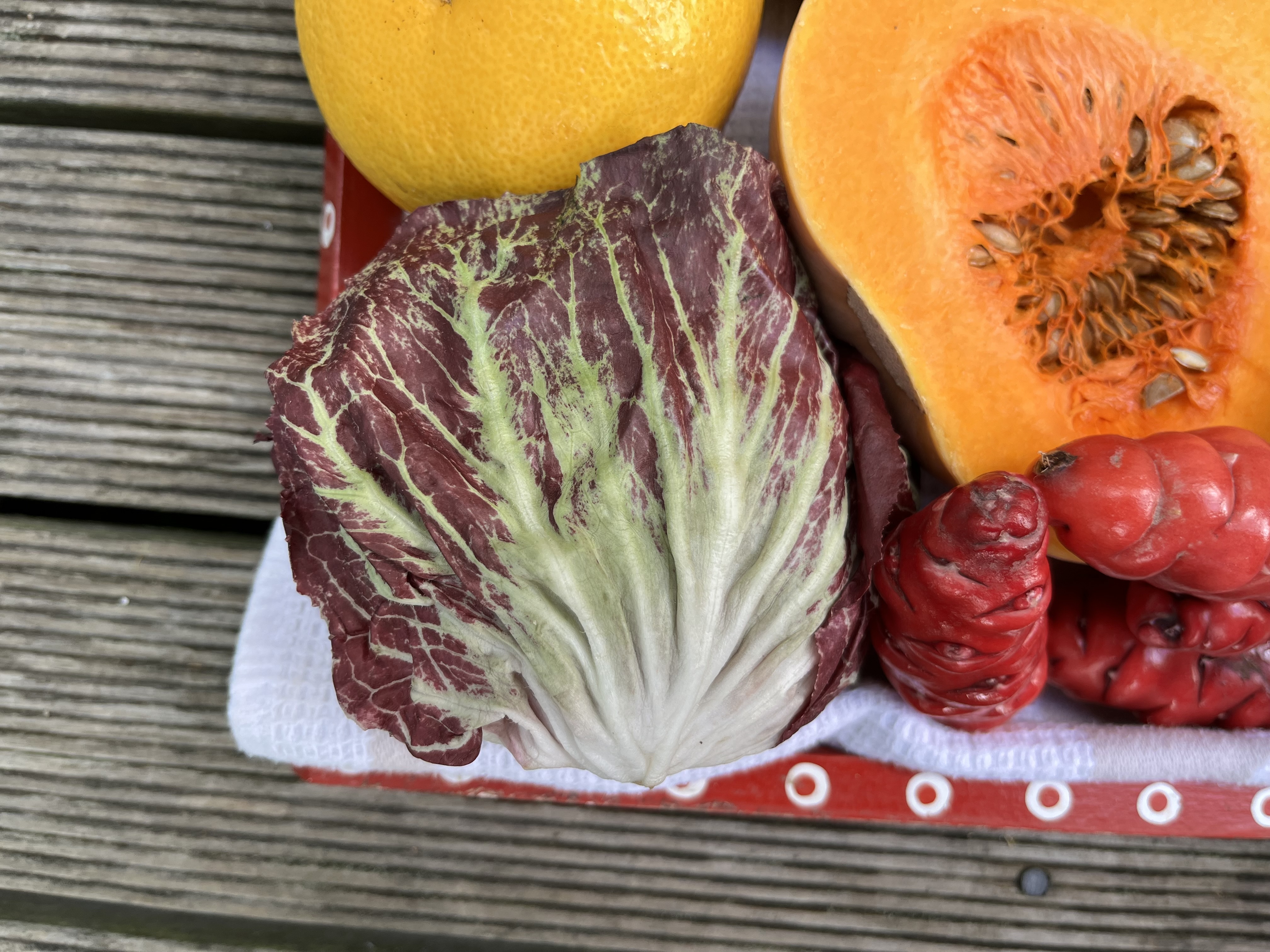 In the basket this week…half a butternut squash that I will roast at some point during the week, a bag of spinach, shallots, apples, a couple of grapefruit and a bag of yams (oca) and this beautiful purple and green radiccio.
