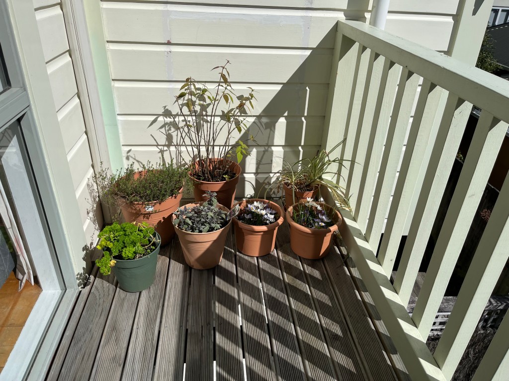 I have still to decide where to put things, but want to keep the thyme and things like the parsley and sage to hand on the balcony which leads off from the kitchen/living/dining room. I’ll get there eventually!