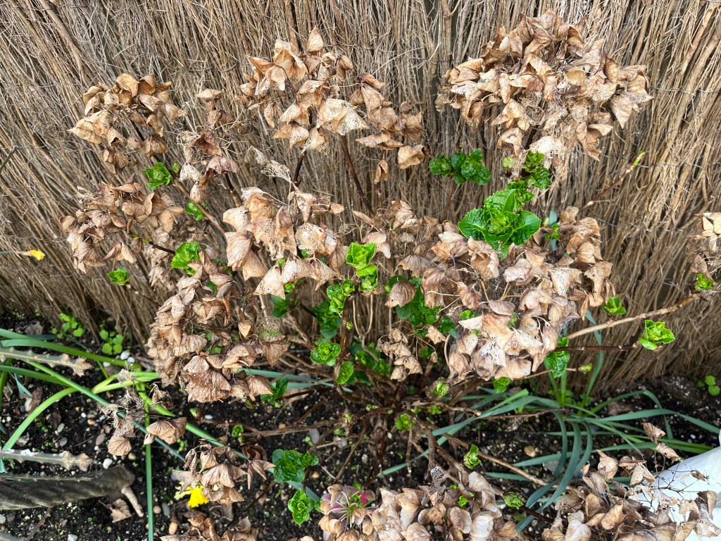In the back yard (it is a paved area with a fantastic laundry drying area), as well as a lovely little display of daffodils, is this hydrangea, at least showing some signs of new life. I guess I should get out there and get rid of the dead heads.