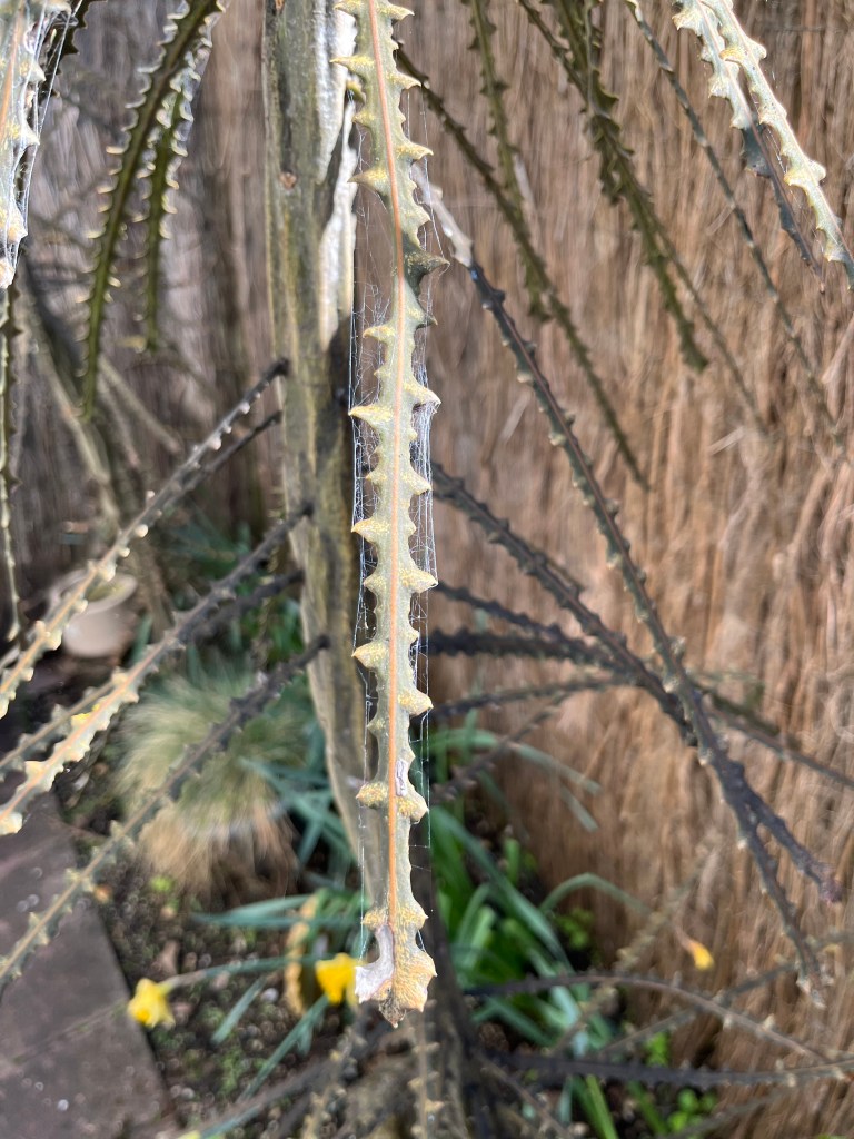 3. I wondered if that was a caterpillar’s work on the lancewood rather than a spider. We get similar coatings on bushes here which protect caterpillars’ eggs. Can you spot the spider?