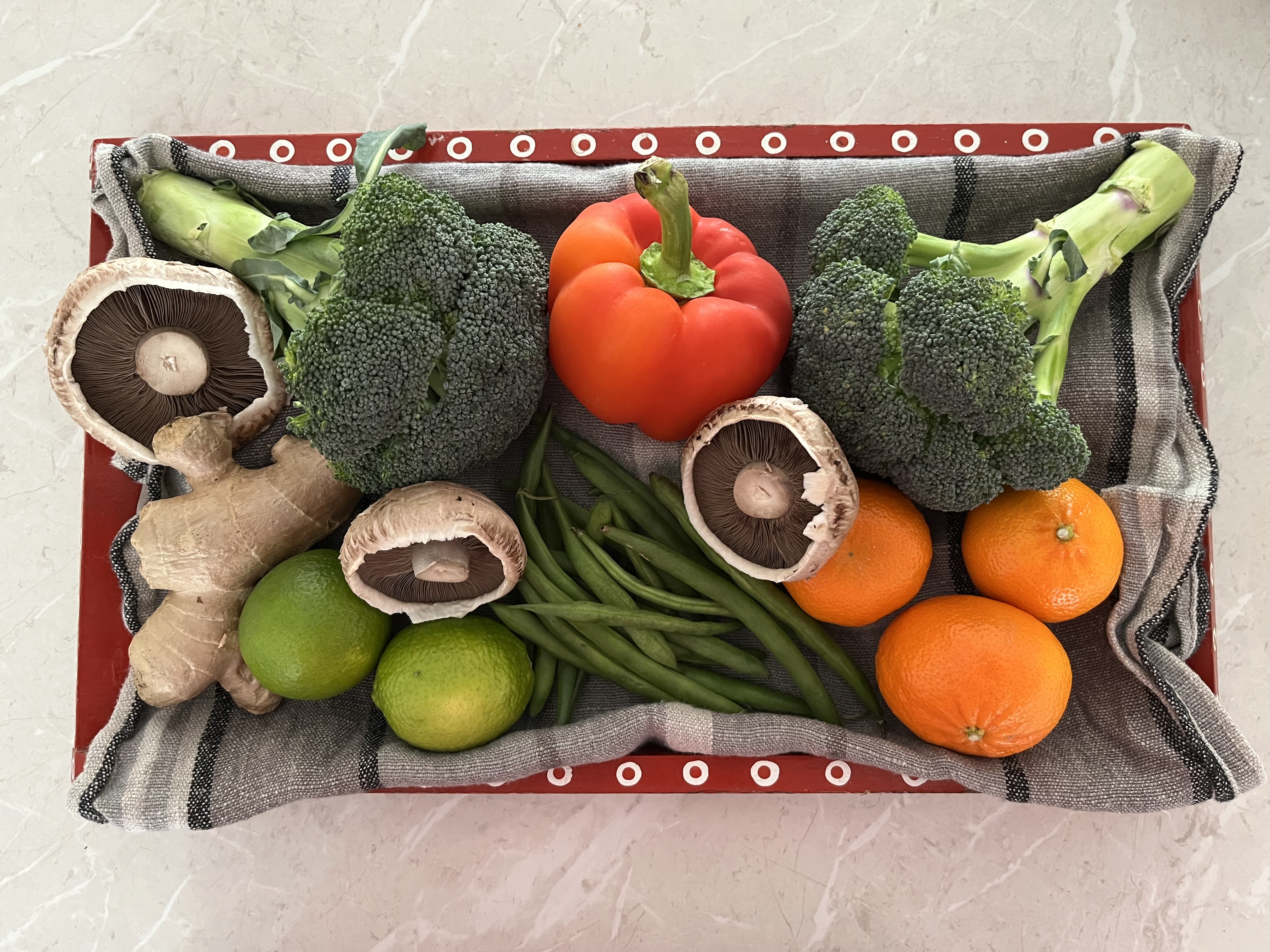 In the basket this week: two heads of broccoli which was on offer, a red capsicum, limes, ginger, mushrooms, green beans and a bag of satsumas for the lunch box. There was a bag of potatoes and a head of lettuce too.