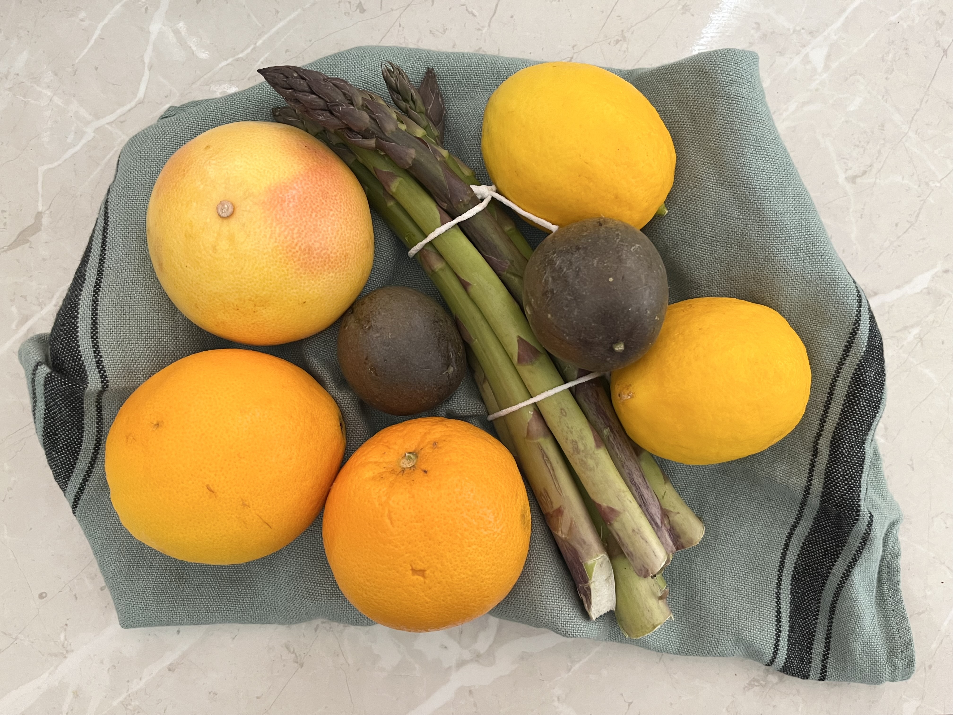 In the Wonky Box this week there were potatoes and onions again, another crispy cos and a pile of yams (oca), along with more avocados (we still have a couple left over from last week), a bunch of asparagus and some broccolini. I picked up grapefruit, lemons, oranges, a couple of passion fruit and a second bunch of asparagus as well.