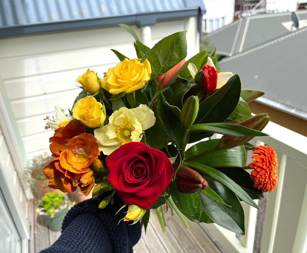 I was working at home today, and took a lunch time walk to our local florist and treated myself to this gorgeous bunch with roses, tulips, freesias and other blooms. The perfect pick-me-up!