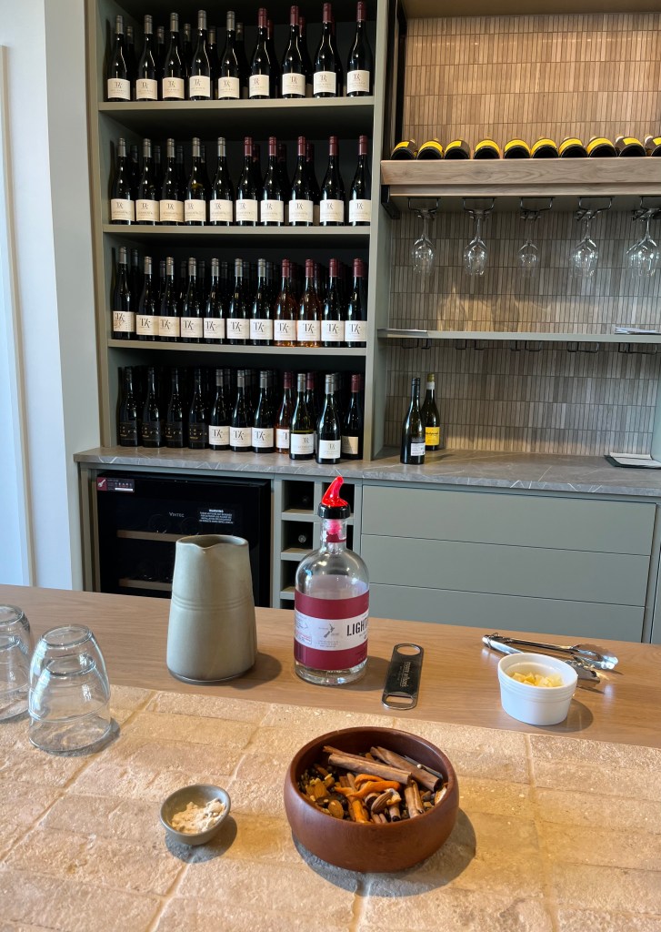We also stopped off at the relatively newly opened The Runholder, which is now home to Martinborough Vineyard, Te Kairanga Wines and soon also to local distillery, Lighthouse Gin. There is a restaurant, tasting room and cellar door offering lunch and wine and gin tastings. It is in a beautiful setting (see below and in the featured image), and we really need to get back there for a long and leisurely lunch some day. Below you can see some of the botanicals that go into the flavouring of the gin as well as the selection of wines.