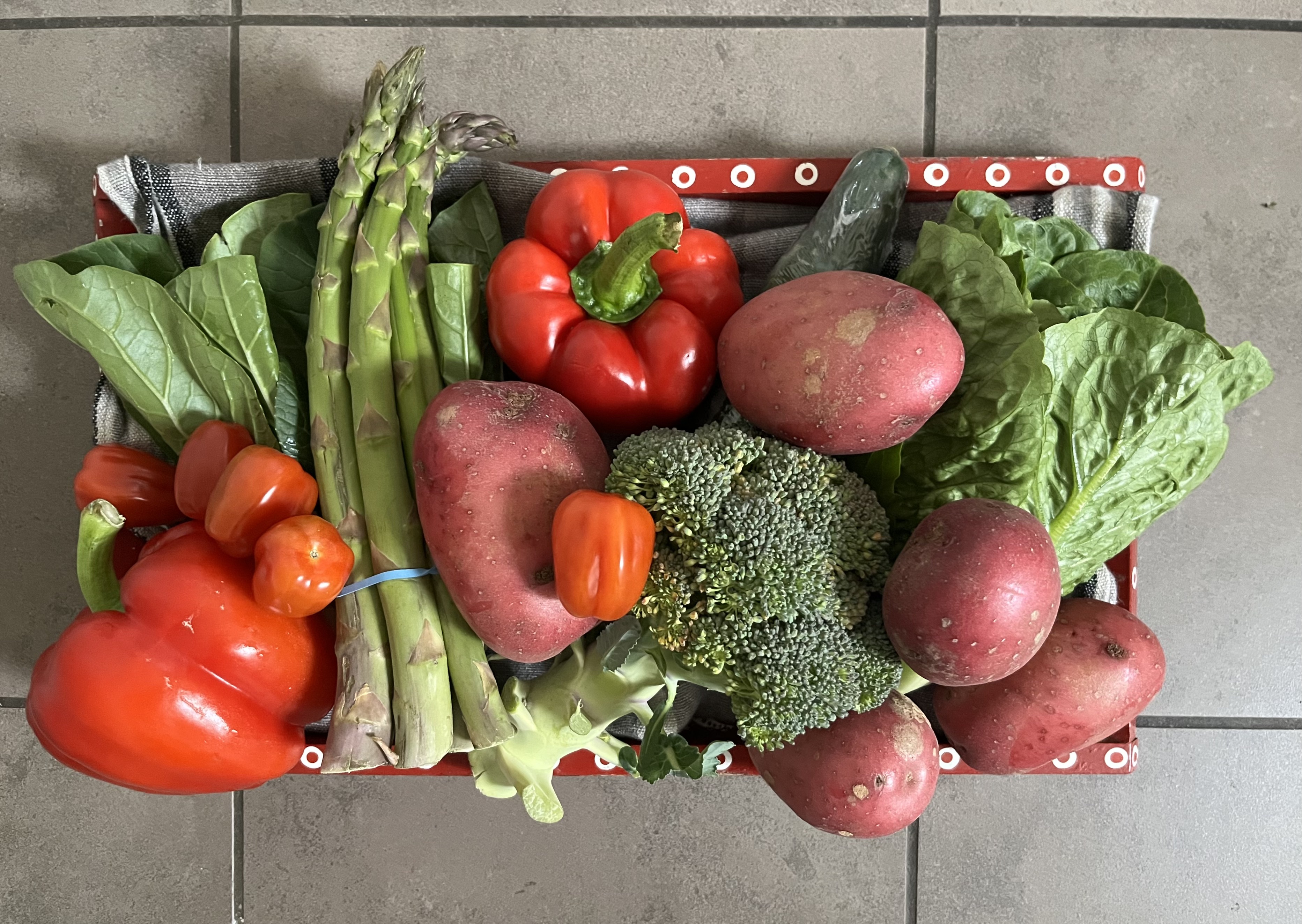 In our Wonky Box this week were some lovely looking red skin potatoes, a cos lettuce, a cucumber, some cherry tomatoes and two bright red capsicum, a bunch of asparagus, a bag of bok choy and a head of broccoli (which I roasted to have with salmon on Saturday). I topped this up with some more asparagus, a bag of rocket, punnets of blueberries and strawberries and little pots of basil and dill.