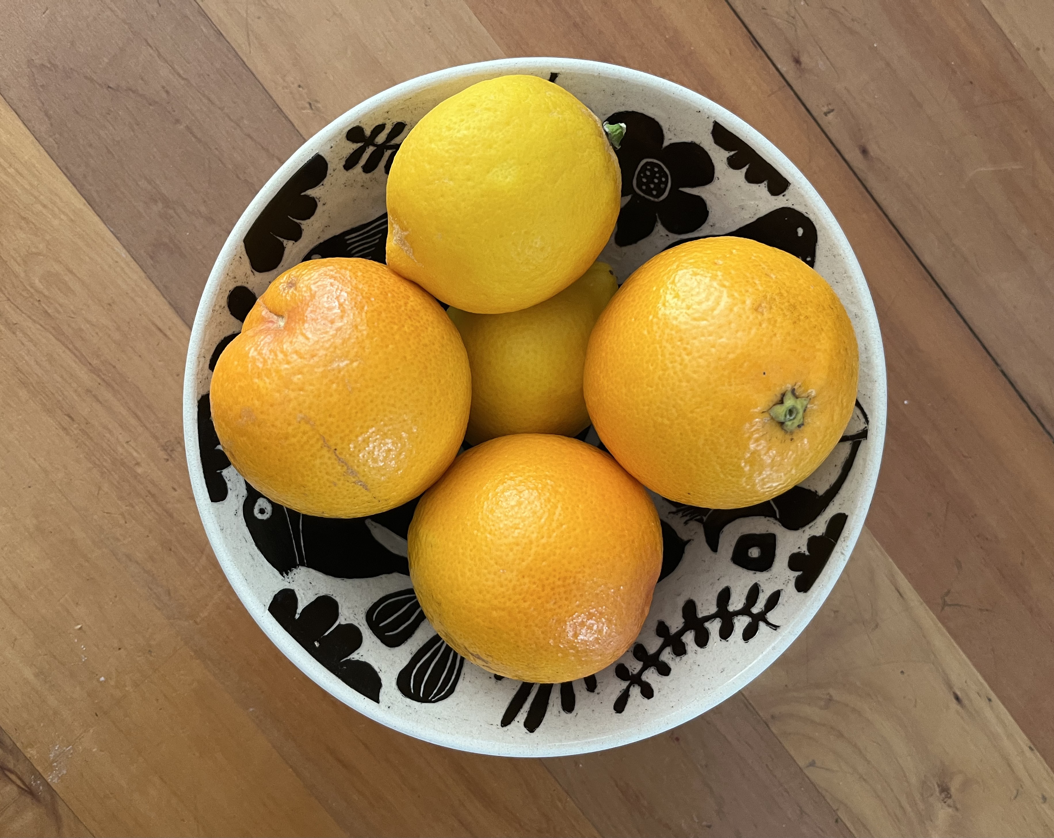 - Looking at the colours of blood oranges and lemons sitting in a bowl.