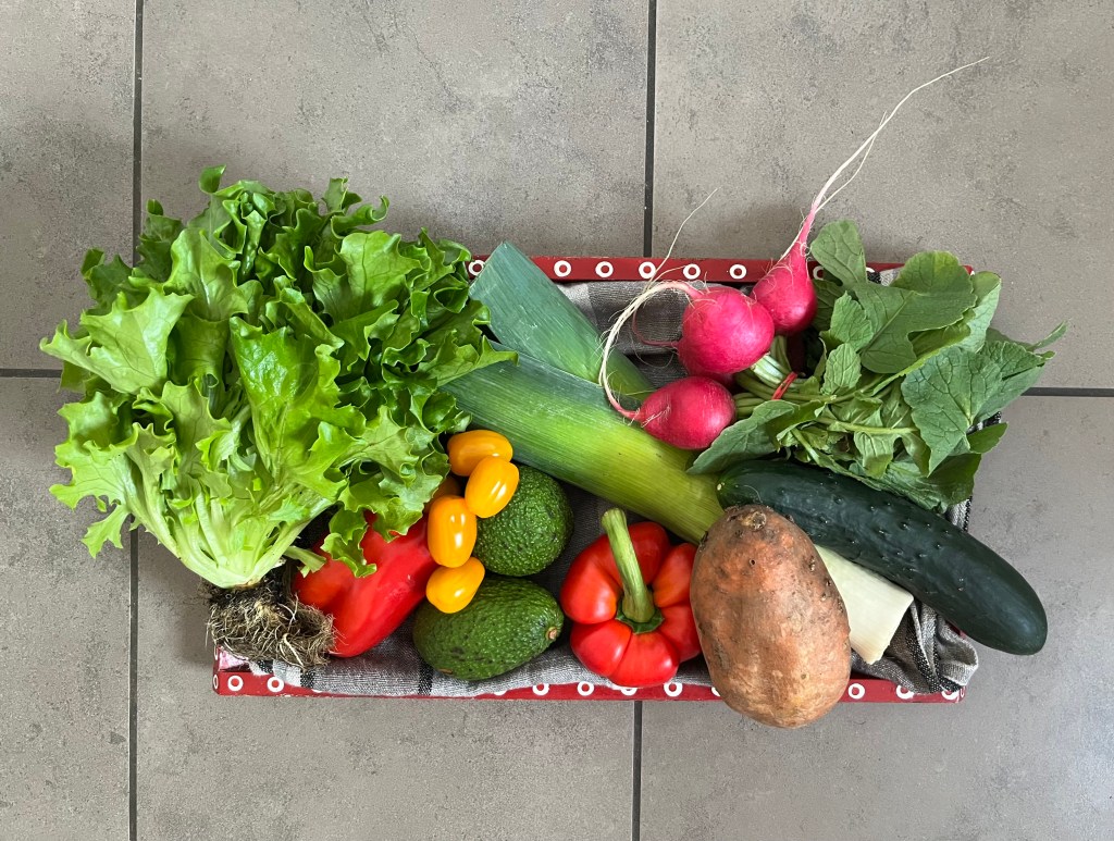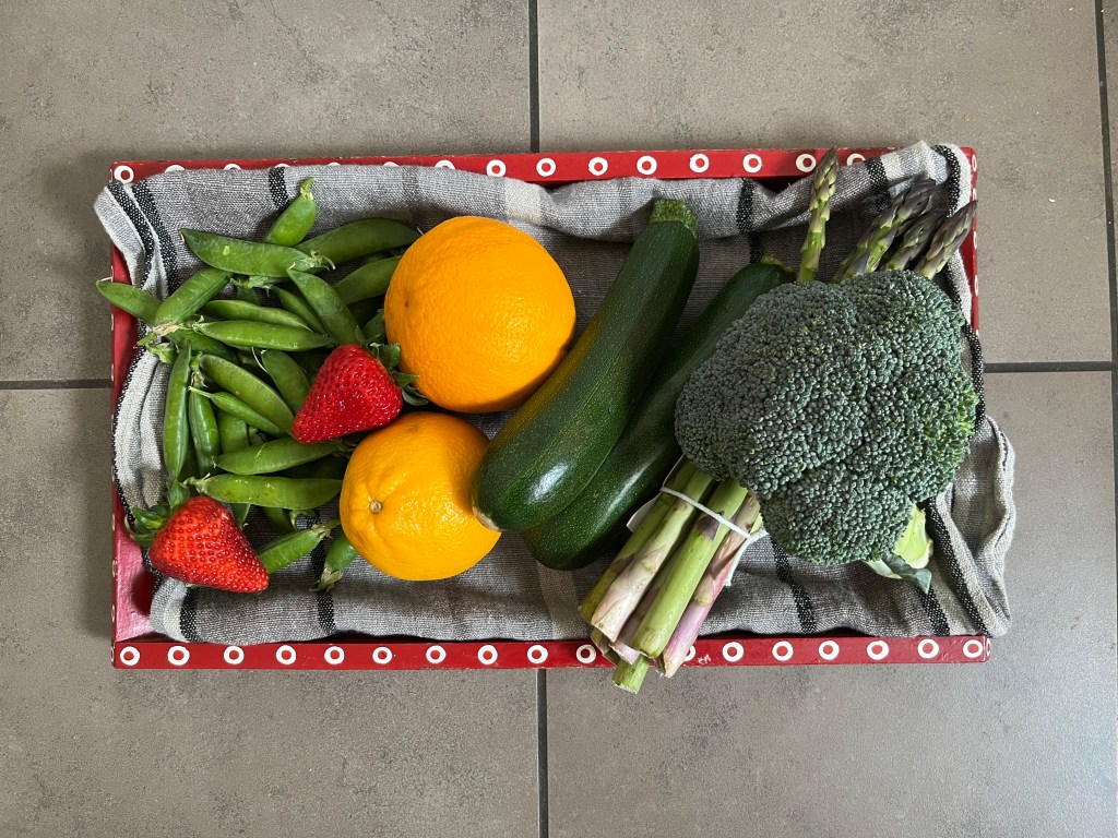 In the Wonky Box this week? A lettuce, a gorgeous bunch of radishes, more capsicum, a cucumber, a leek, two avocados, kumara and some cherry tomatoes. I supplemented this with a head of broccoli (enjoyed on Sunday, roasted), asparagus, courgettes, peas, oranges, strawberries and raspberries – oh what abundance! I made a kumara, sausage and capsicum bake for dinner on Saturday, and roasted the broccoli with the other half of capsicum to have on the side with lamb on Sunday.