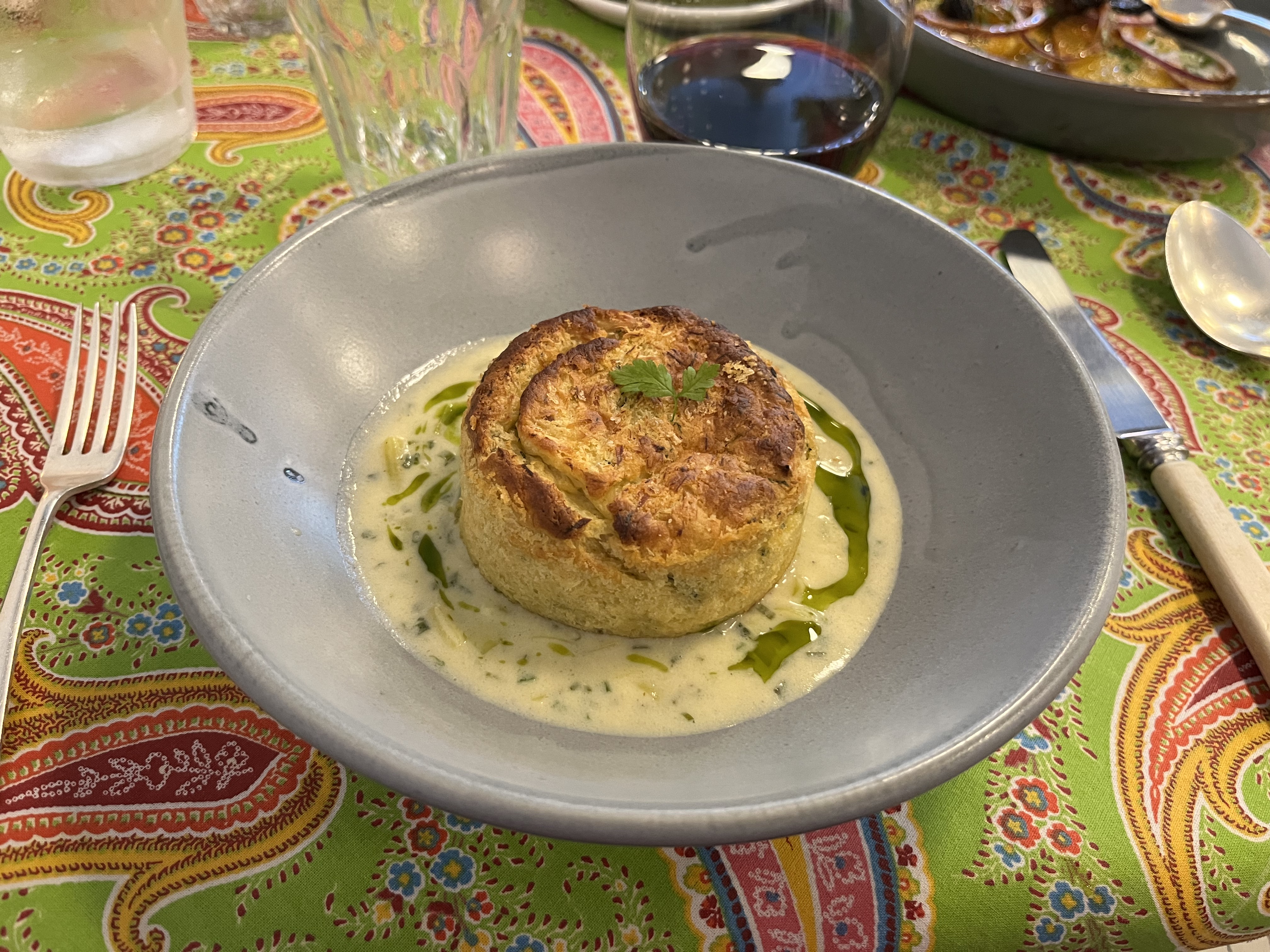 The final menu is composed of favourites from past menus, including many from past Wellington on a Plate events, Anyway, we shared cigares au thon (a cigar shaped pastry with tuna) and pantra (lamb stuffed pancake) with some labneh with preserved lemon on the side. Karl opted for the polpette di pollo in bianco (chicken meatballs in white wine sauce) and I had the smoked fish soufflé with leek and chive sauce. We had the orange salad with dried olives on the side.