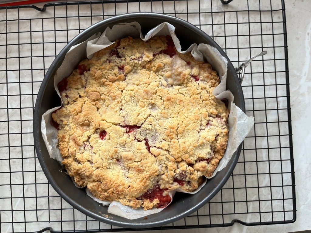 A few weeks ago I bought Tilly Pamment’s The Plain Cake Appreciation Society which I mentioned in last month’s book post. I have to say, that I have now made three cakes from this glorious book and every one has turned our beautifully and quite lovely. As it was my Name Day on Monday, I decided to make this Strawberry Streusal Cake. In the Northern Hemisphere, my birthday is in summer, and I always enjoyed strawberries on the day. Of course, my birthday is now in winter, so no strawberries, but I can still enjoy strawberries on my Name Day which is now in Southern Hemisphere summer (are you following?).