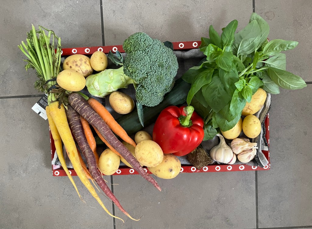This week’s Wonky Box had a lovely big bunch of basil, potatoes, broccoli, a bright red capsicum, brocooli, a gorgeous bunch of baby carrots and (not shown) a bag of baby spinach. I added some tomatoes and radishes, and of course blueberries, raspberries and strawberries, it being the season for such things.