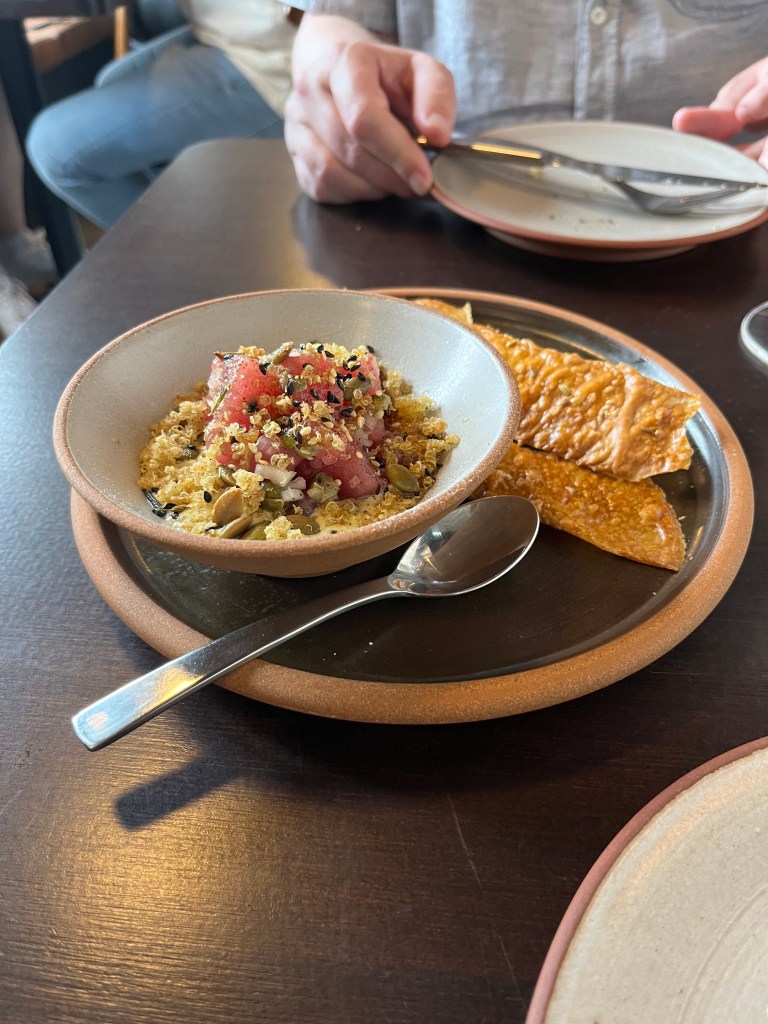 On Thursday evening we treated ourselves to a gorgeous dinner at Rosella Wine Bar, a relatively new venture from the owners of Koji (a place we need to go back to soon). We opted for the ‘chef’s choice’ of eight selected dishes from the menu. This included the pickled mussels with wasabi aioli and black bean dressing (which was probably my favourite), a gorgeous potato flatbread with cumin salt and tuna crudo with bonito, grains and seeds.